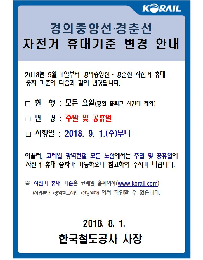 | 자전거 휴대승차 확대 및 조정 | 토요일, 법정공휴일에는 자전거를 휴대 및 승차할 수 있다. 단, 운영기관의 정책에 따라 확대 또는 조정 가능하다. |