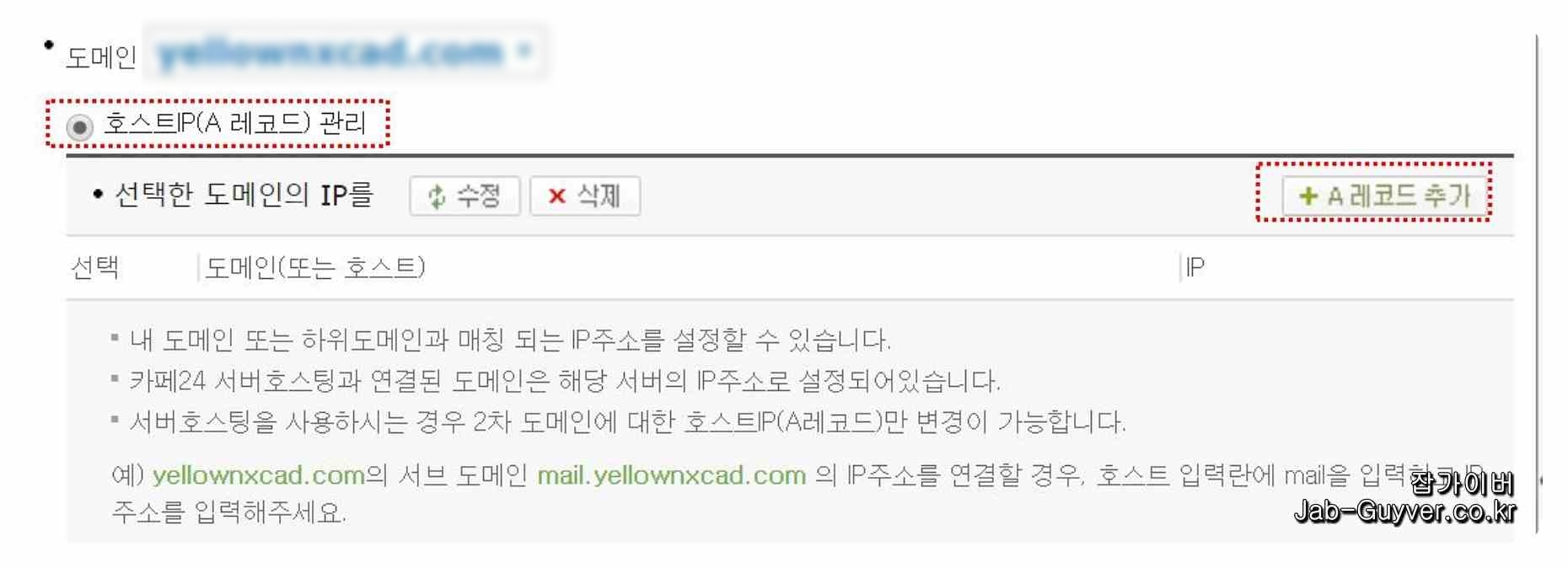 카페24처럼 이 부분에서 제약이 있는 곳에서는, 루트 도메인을 티스토리에 연결하려면 A 레코드를 이용해 티스토리 IP를 직접 적어주는 방식을 씁니다.