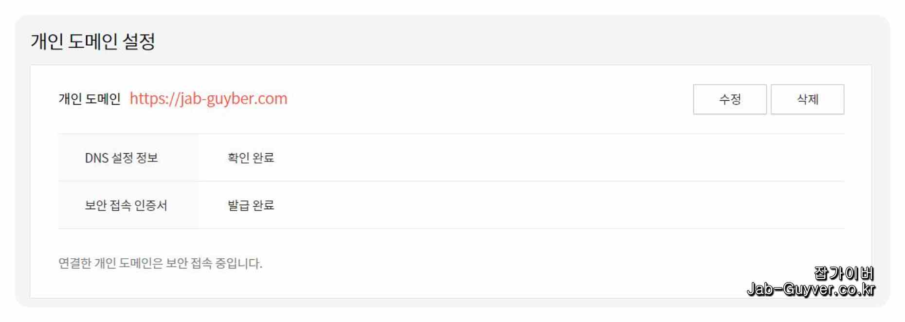 DNS가 제대로 연결되면 위와 같이 DNS 설정 정보가 확인되었습니다라는 메시지가 나오고, 이때부터 새 도메인으로 블로그에 접속할 수 있습니다.