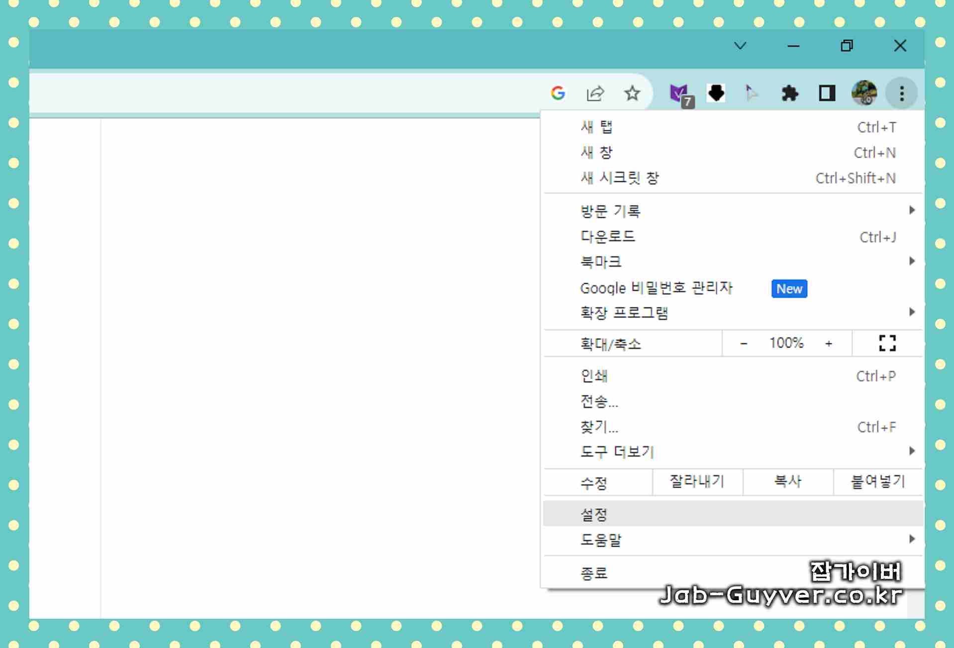 크롬의 오른쪽 상단에 위치한 메뉴 아이콘(세 개의 점)을 클릭한 후 '설정'을 선택합니다.