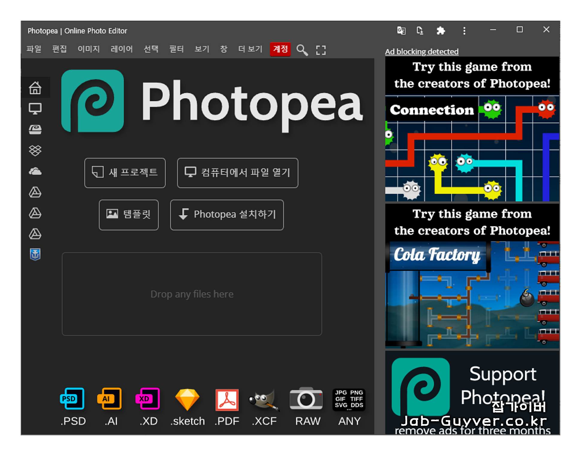 그러나 PIXLR의 가장 큰 단점은 PSD 파일을 편집할 수 없다는 것이었습니다. 이 문제를 해결하기 위해 Photopea를 소개하고자 합니다. Photopea는 포토샵의 PSD 파일을 편집할 수 있는 뿐만 아니라 AI 파일도 편집할 수 있는 강력한 온라인 도구입니다. 또한 PSD 파일을 저장하거나 이미지 파일을 내보낼 수 있는 다양한 장점이 있습니다.