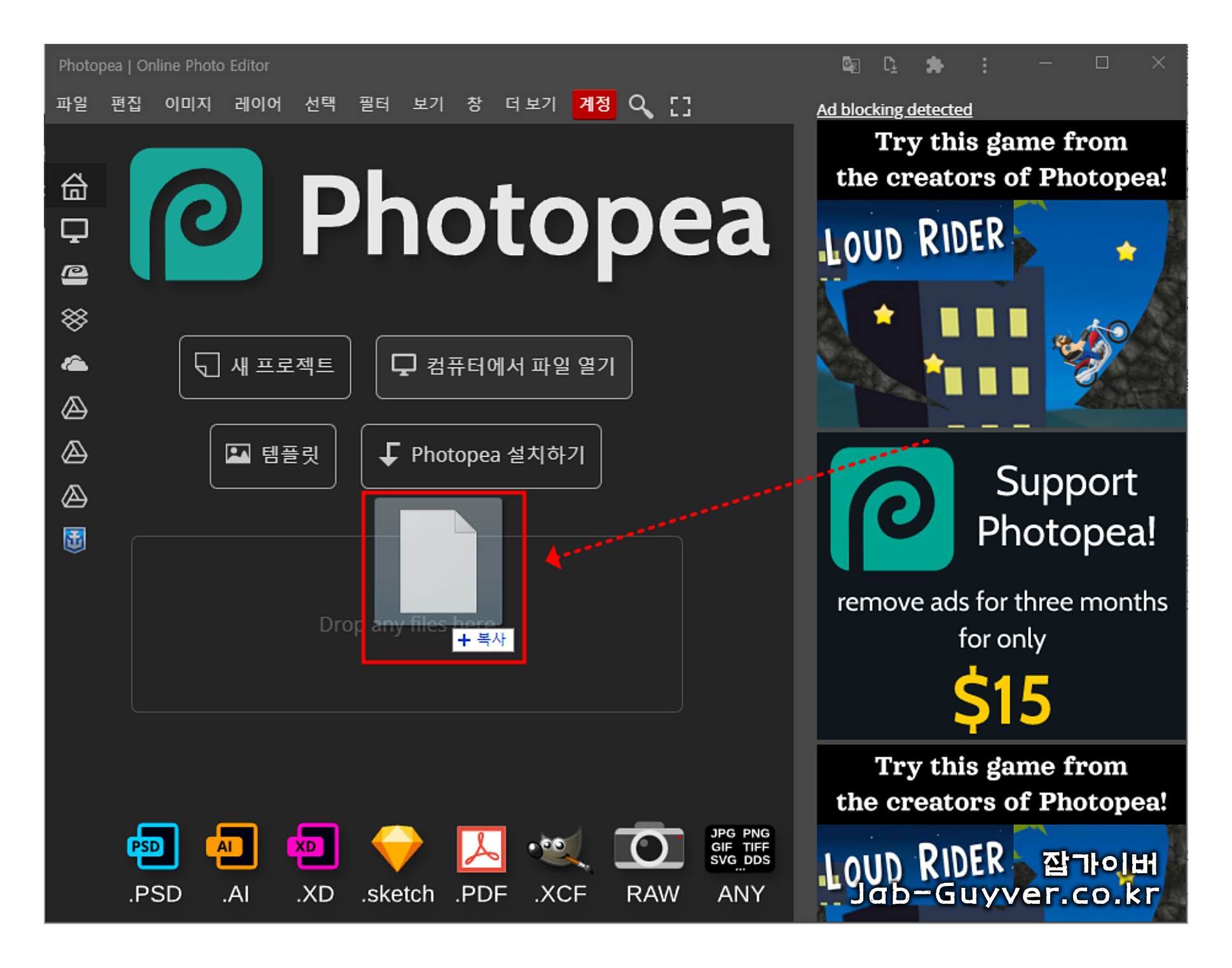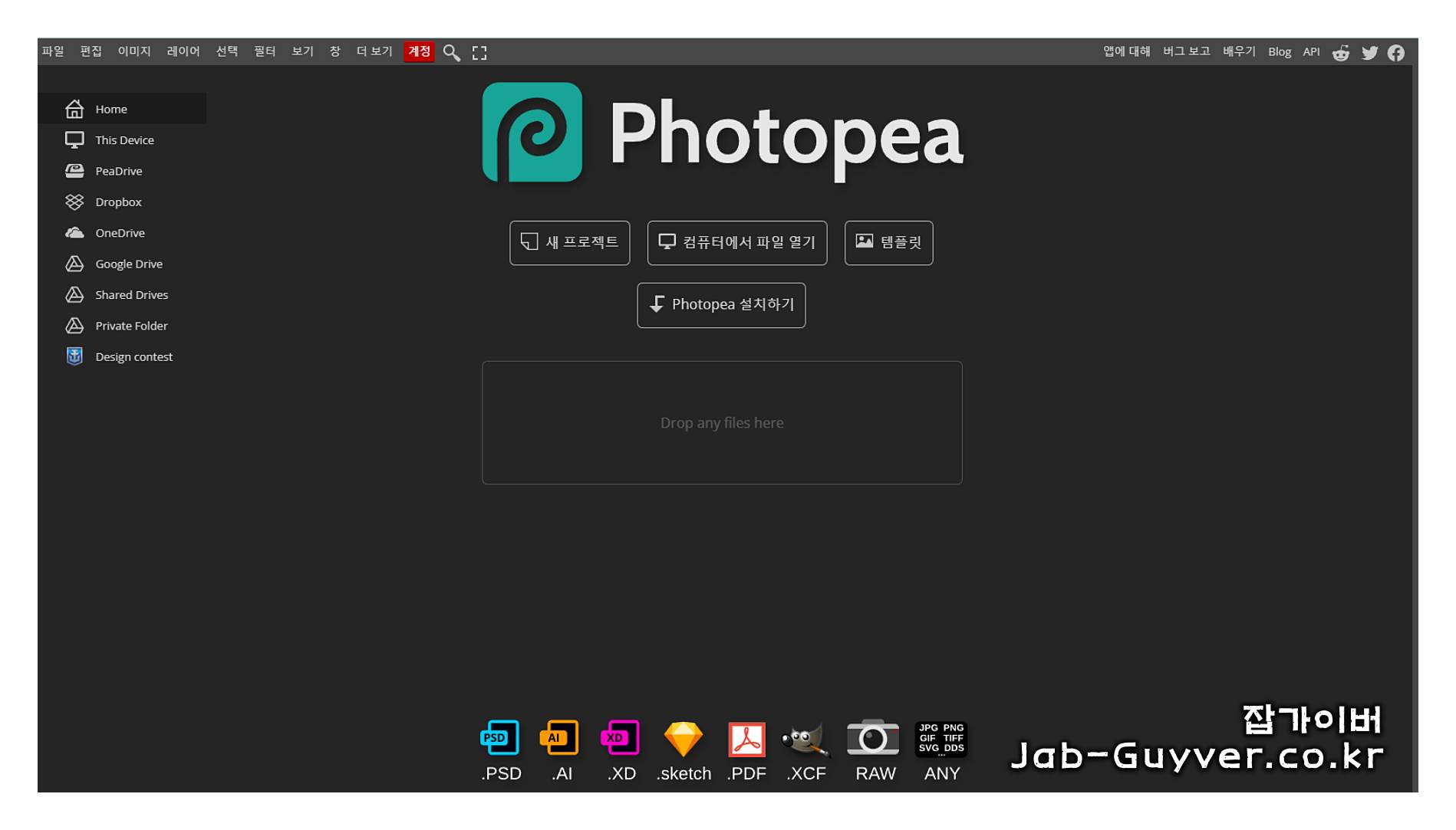 Photopea는 로컬 PC에 저장된 포토샵 PSD 파일 뿐만 아니라 일러스트레이터 AI, XC, 스케치, PDF, XCF, RAW, 그리고 ANY 확장자를 가진 파일을 모두 지원합니다.