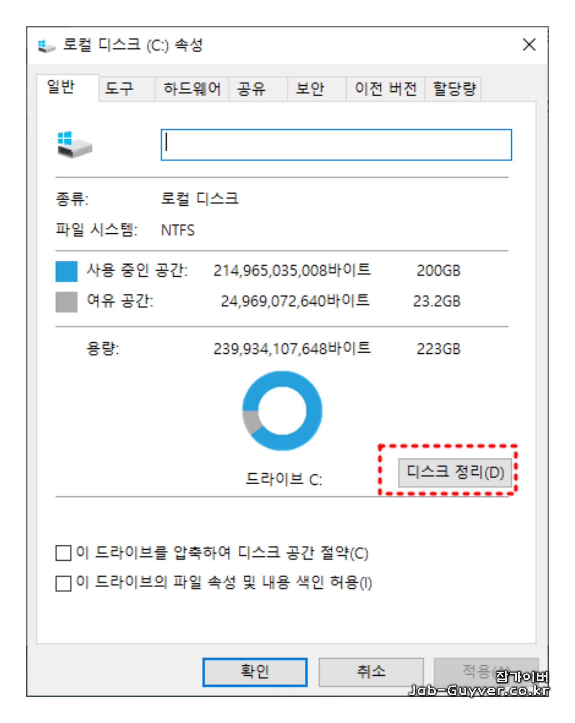 ③ C: 드라이브 속성 창에서 디스크 정리 버튼을 클릭합니다.