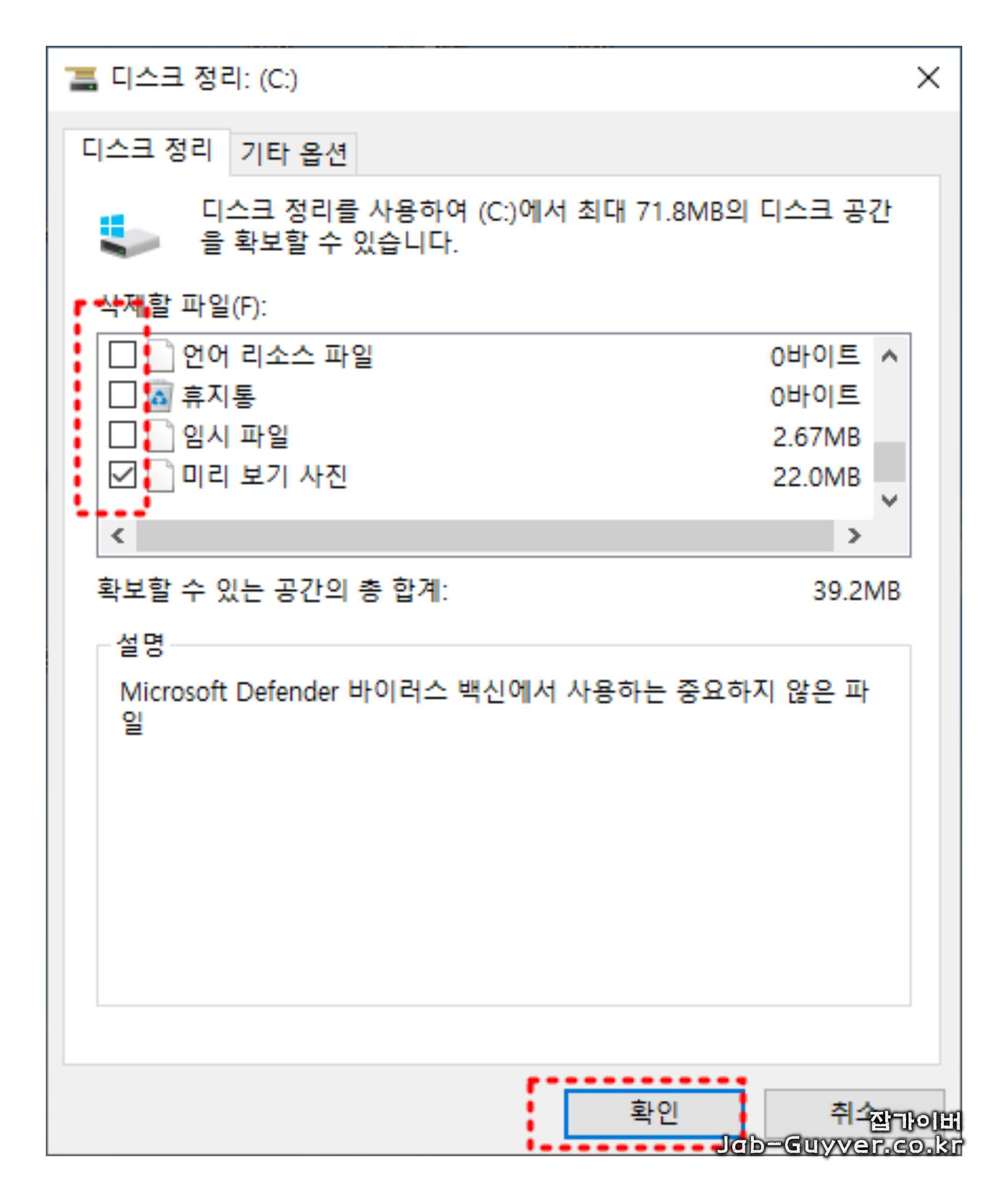 ⑤ 필요 없는 파일을 모두 선택하고 삭제한 뒤, 다시 한 번 여유 공간을 확인합니다.
