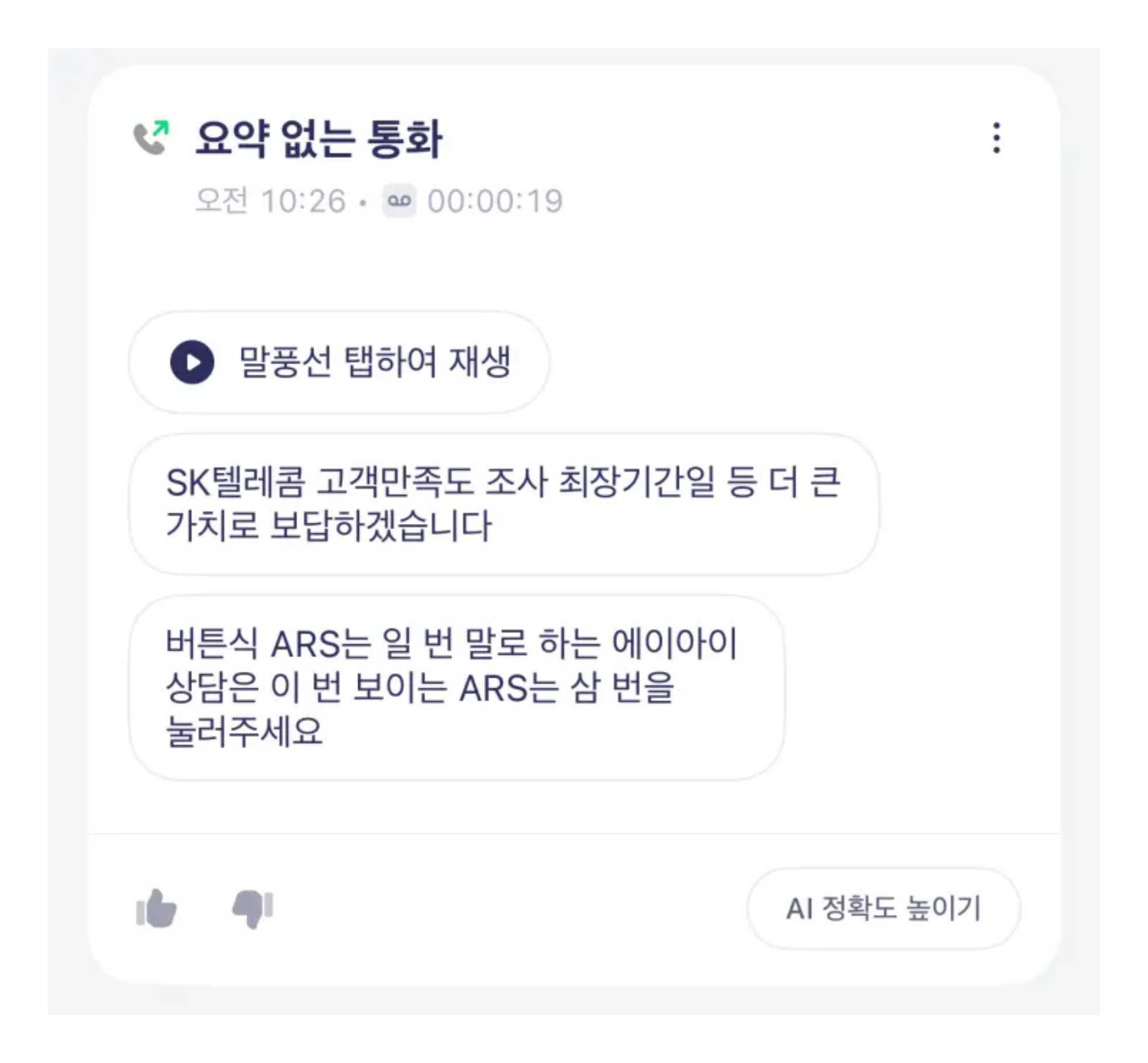 통화를 종료하면 녹음 파일이 생성되며, 이 녹음 파일은 STT(Speech To Text) 변환을 통해 채팅 형태로 제공됩니다. 또한 전화의 주요 내용에 대한 한 줄 요약, 문단별 상세 요약, 대표 태그, 통화 중에 언급된 일정, 전화번호, 계좌번호 등과 관련된 AI 제안도 생성됩니다. 녹음 파일에 대한 음성 재생과 통화 텍스트 및 요약 검색도 지원됩니다.