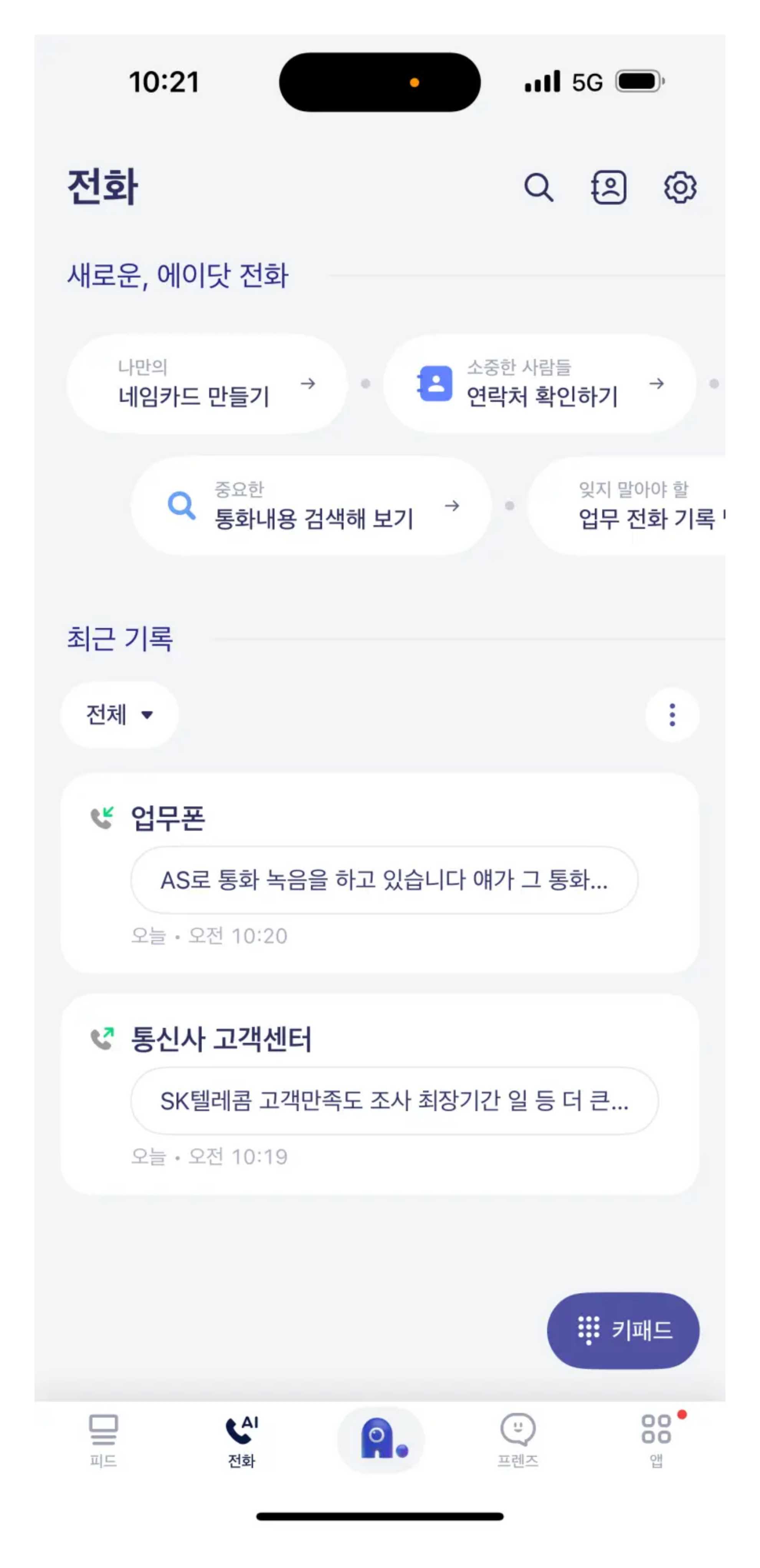 전화통화 발신 시에는 에이닷 앱 내 AI 전화 메뉴에서 직접 번호를 입력하거나, 이전에 통화한 연락처를 탭하여 기존 전화 앱과 유사한 방식으로 이용할 수 있습니다. 또한 상대방과 이전에 에이닷 전화로 통화한 이력이 있다면 발신 중에 이전 통화 요약이 제공됩니다.