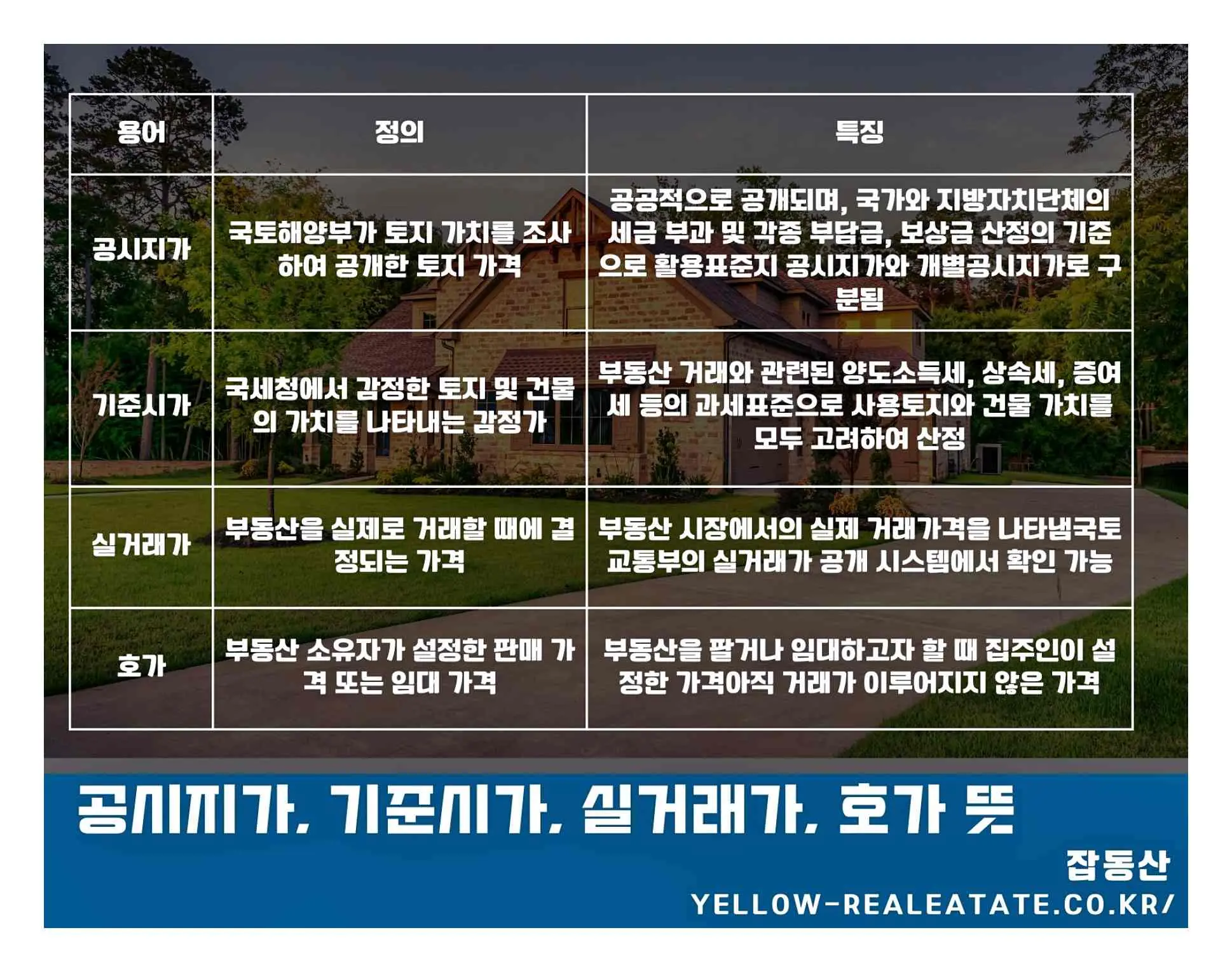 | 뜻 | 국토해양부에서 정한 토지의 가치를 의미 | 국세청에서 감정한 부동산의 가치를 의미 | 실제 부동산 거래 시 결정되는 가격 | 부동산 소유자가 설정한 판매 또는 임대 가격 |