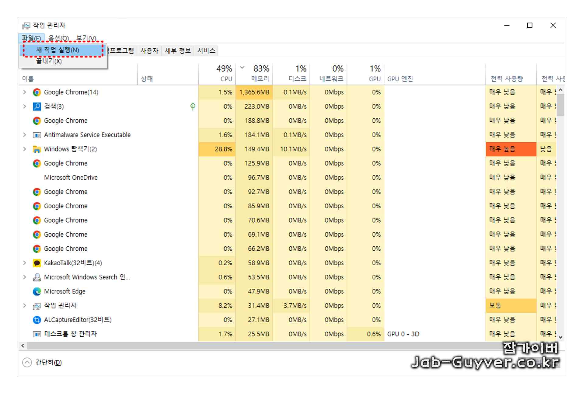 2. '파일' 메뉴에서 '새 작업 실행(Run new task)'을 선택합니다.