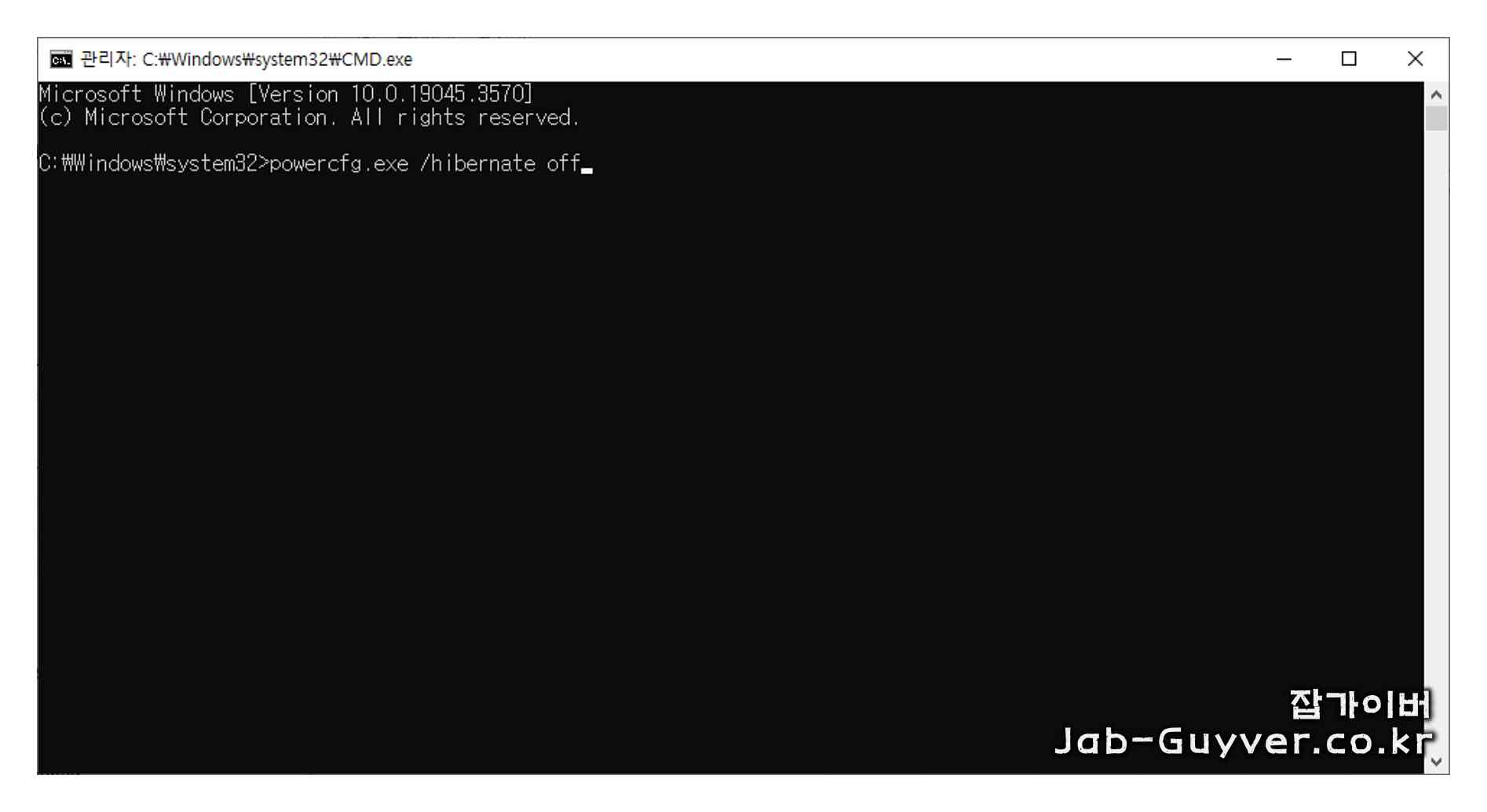 4. 명령 프롬프트에서 `powercfg.exe /hibernate off` 명령어를 입력하고 엔터 키를 누릅니다.