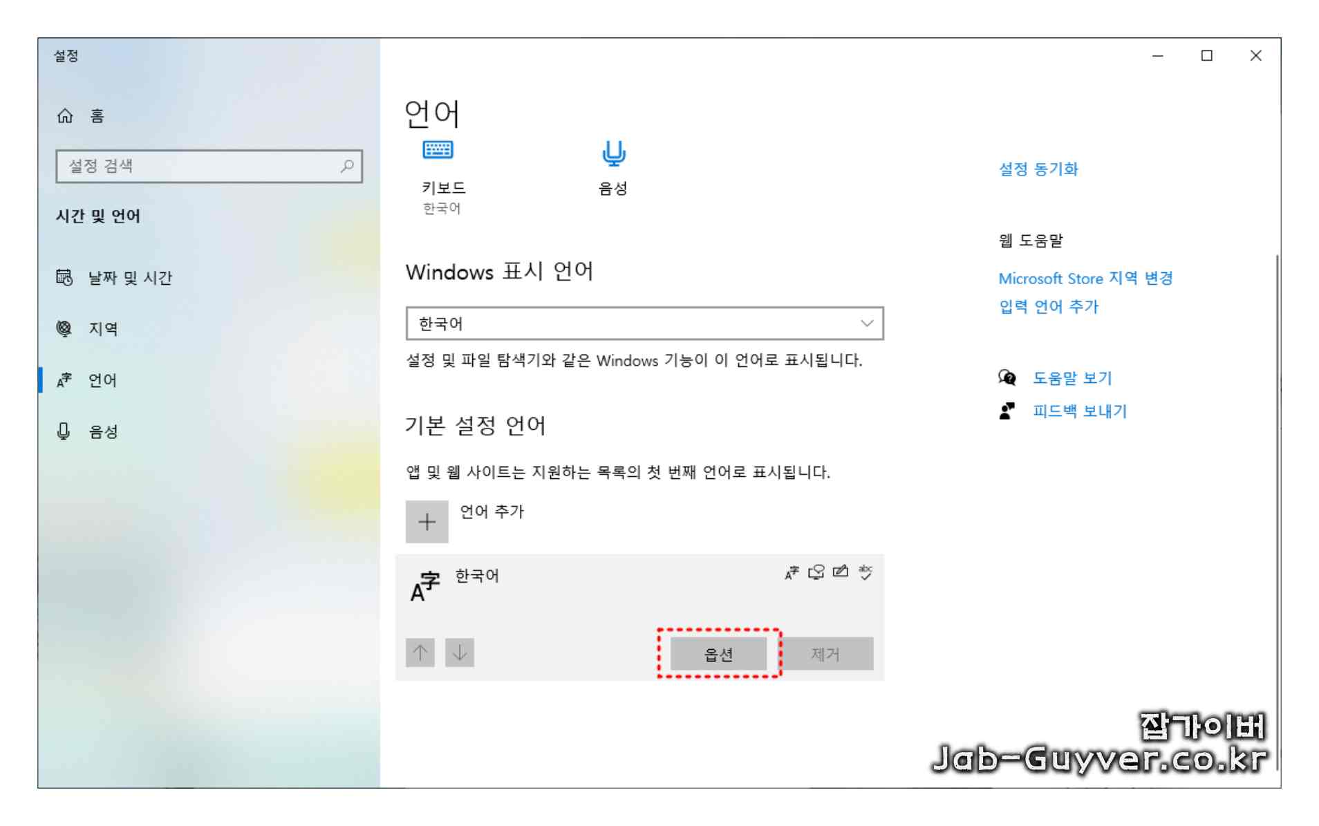 윈도우 설정의 [언어] 항목으로 진입한 후, 한국어 설정의 [옵션] 메뉴를 클릭합니다.