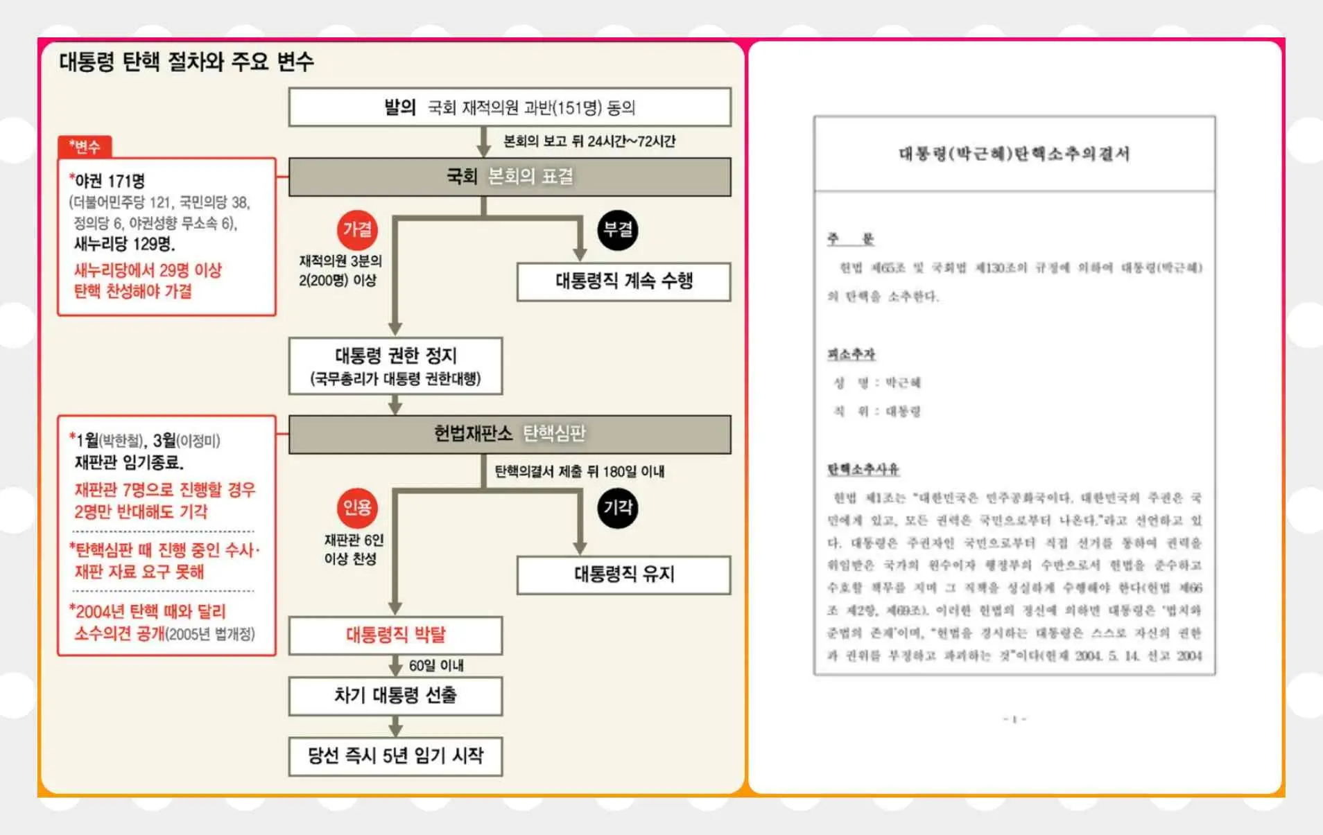 대한민국 헌법 제65조에 이러한 대통령 탄핵 절차와 조건이 명시되어 있으며, 탄핵결정은 공직으로부터 파면됨을 의미하지만 민사상이나 형사상의 책임은 면제되지 않는다는 원칙이 적용됩니다.