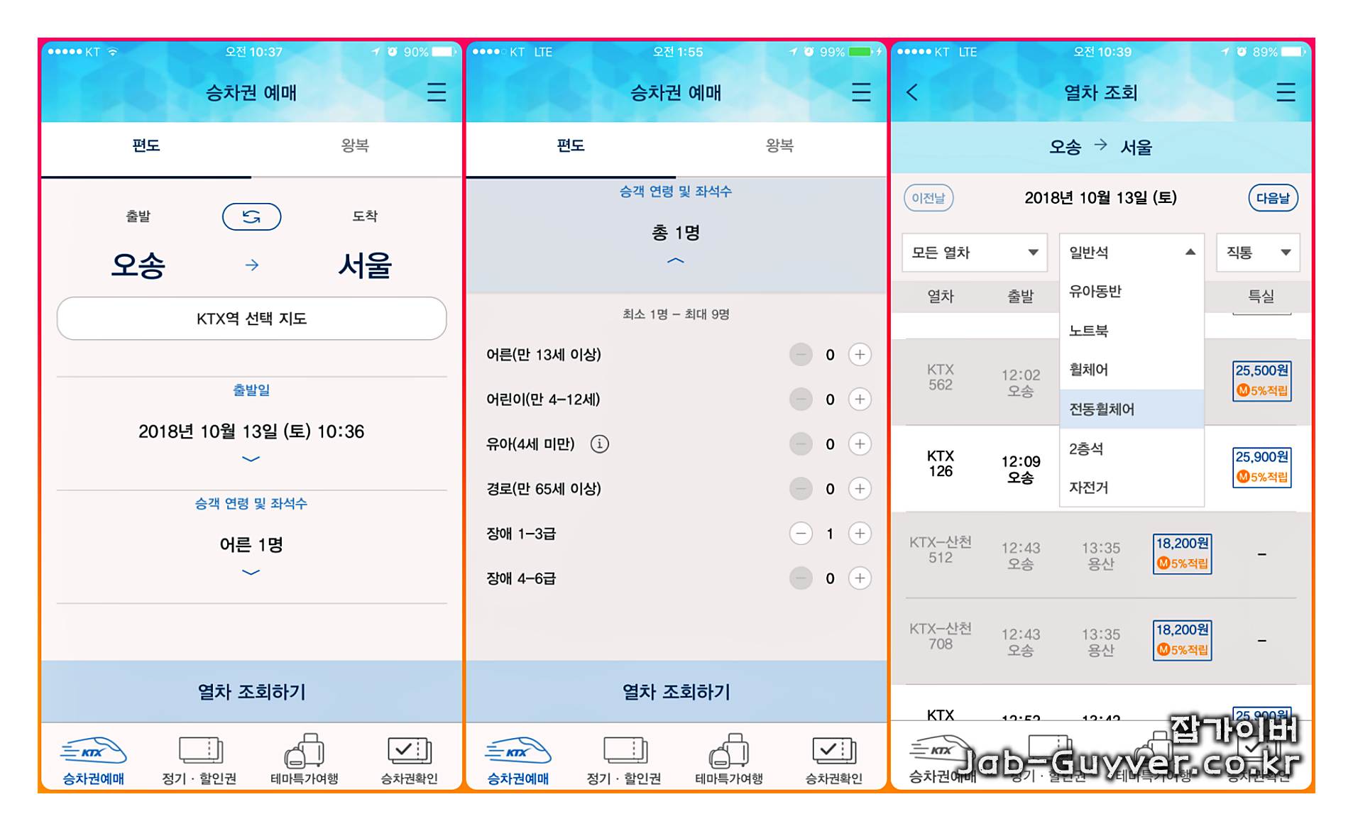 코레일톡 앱을 열고 출발지와 도착지, 이용일자, 좌석 수 등의 정보를 입력하고 열차 편을 조회합니다.