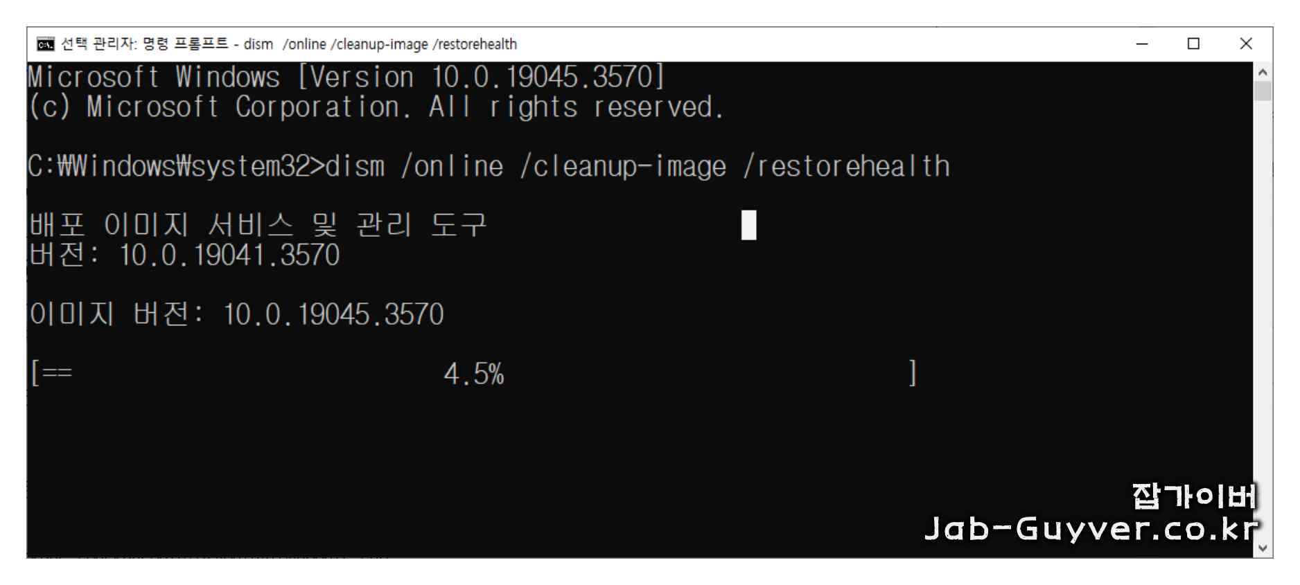 시간은 짧게는 10분 내외정도 걸릴 수 있지만 인터넷 연결상태 및 시스템 상황에 따라 최대 2시간 이상 소요될 수 있으며 만약 명령어 사용 시 실행이 안된다면 관리자권한으로 실행했는지 다시한번 체크해보세요