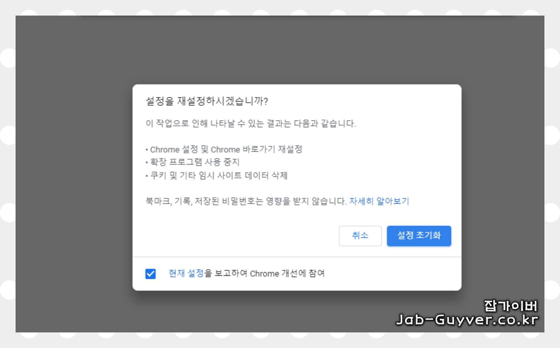 크롬 설정에서 '재설정 및 정리' 메뉴를 찾아 '설정을 기본값으로 복원'을 선택하여 초기화를 진행합니다.