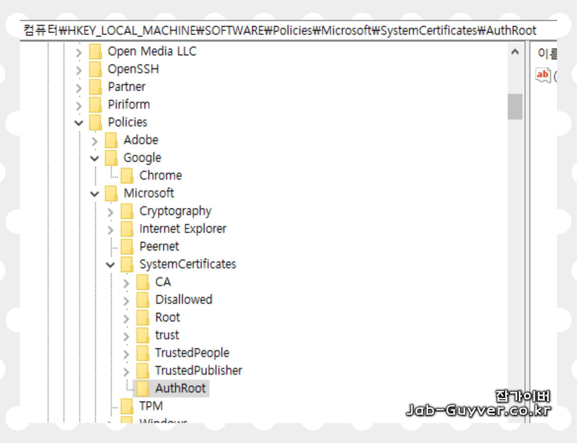 위 경로로 이동 후 이 경로에서 'Authroot'를 찾아 해당 값을 수정하거나, 존재하지 않는 경우 새로 생성합니다.