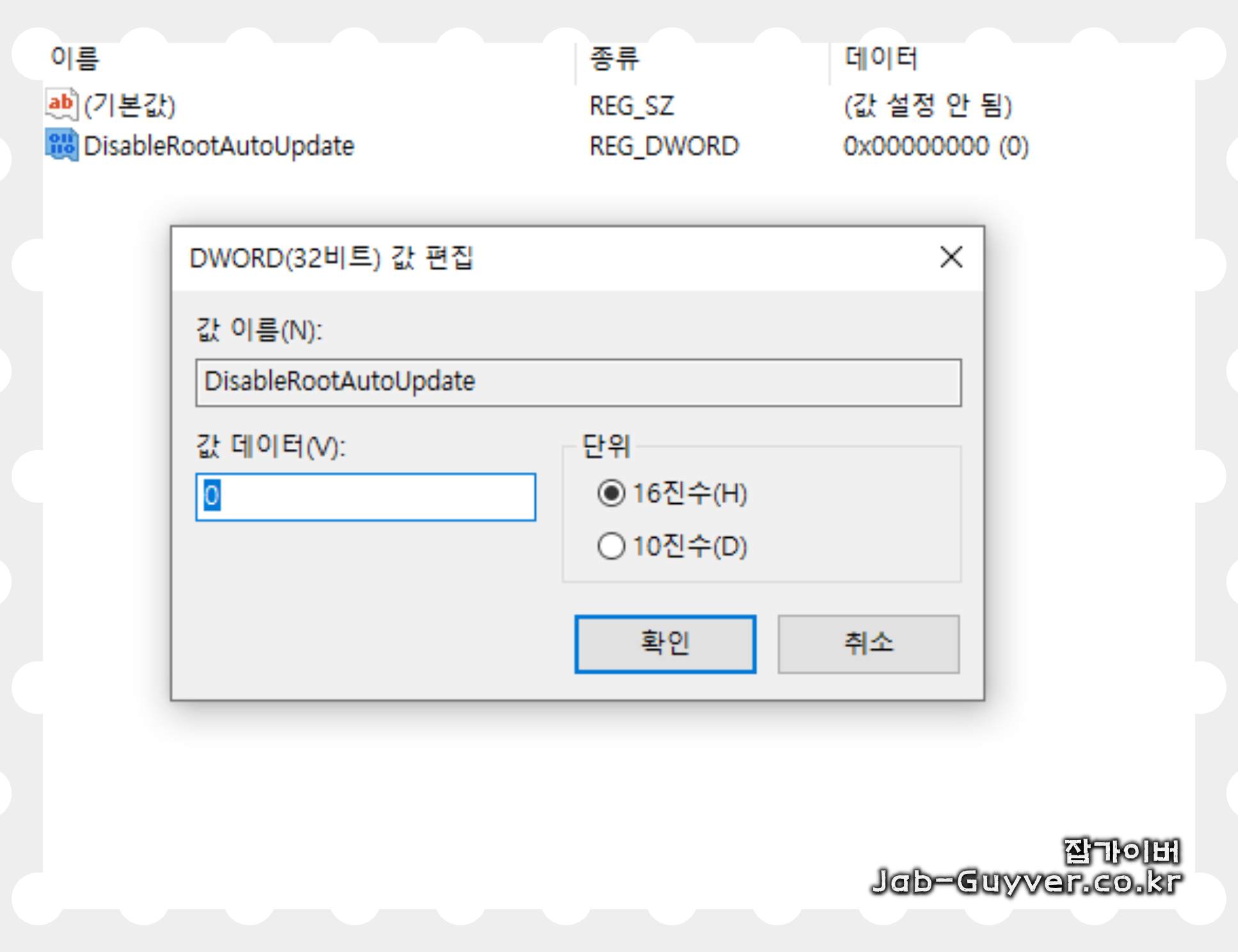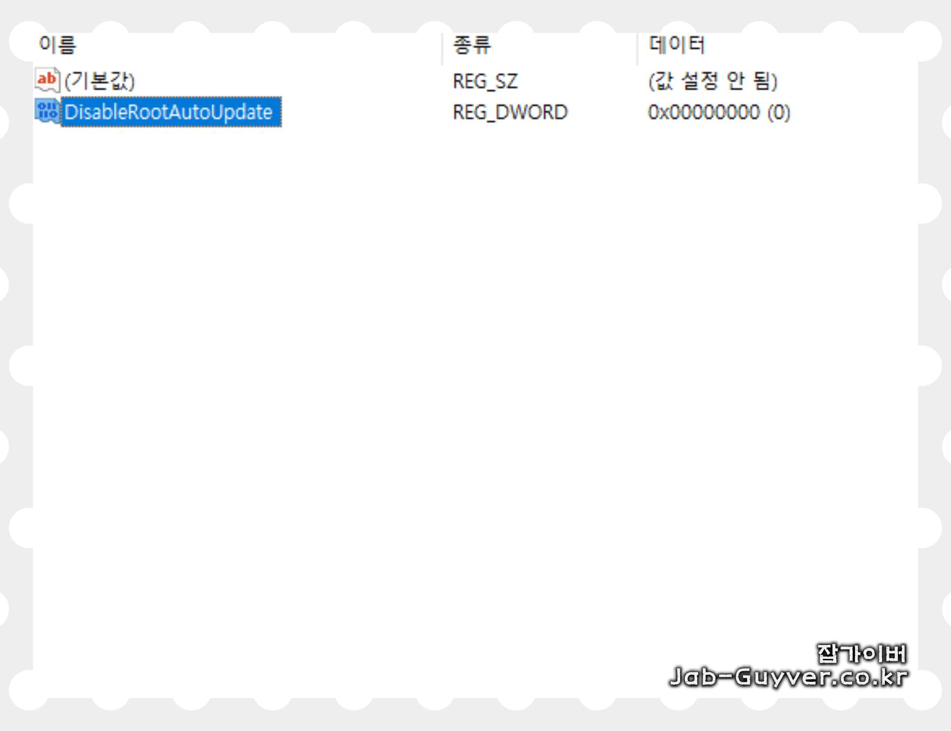 마우스 우클릭 후 새로 만들기 - DWORD(32비트) 값 추가한 다음 이름을 'DisableRootAutoUpdate' 설정합니다.