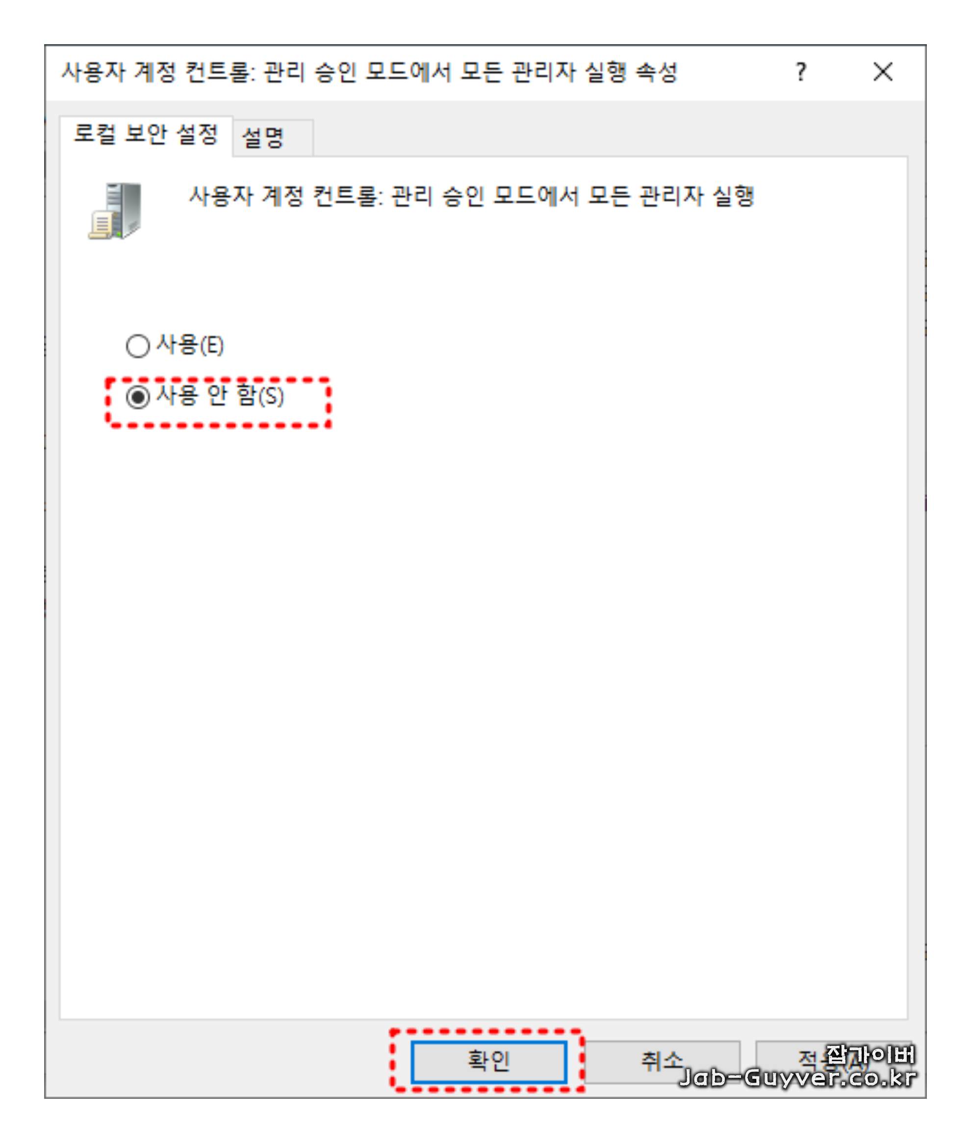 용자 계정 컨트롤: 관리 승인 모드에서 모든 관리자 실행 사용안함