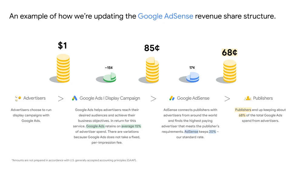 콘텐츠용 애드센스, 즉 블로거들이 다는 애드센스는 현재까지 수익의 68%를 지급해왔으나, 앞으로는 플랫폼 관계 없이 광고주 플랫폼에서 수수료를 받은 후 수익의 80%를 받게 될 예정입이며 이는 기존보다 더 높은 수익 구조를 의미합니다.