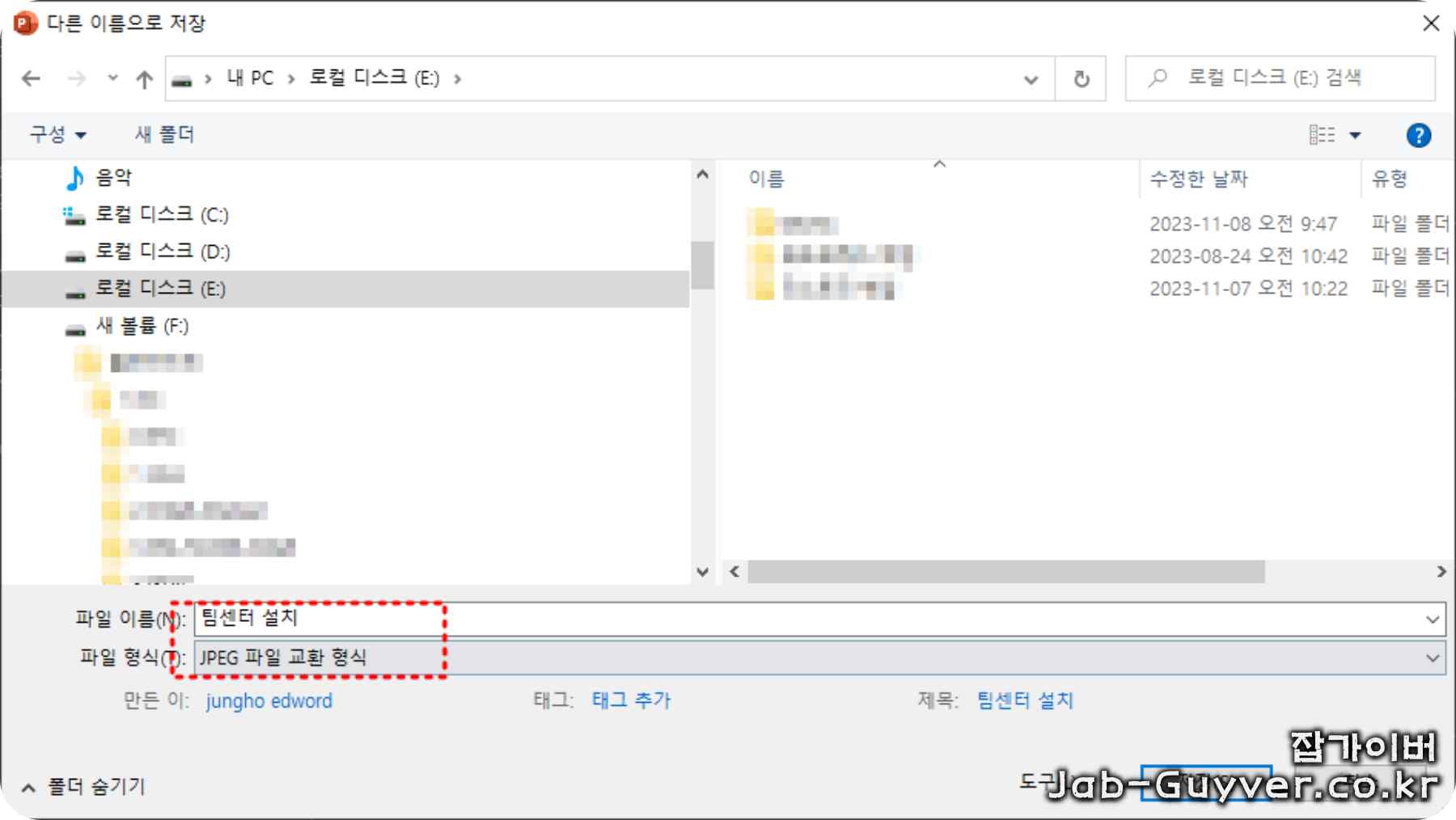 이때 저장하고자 하는 파일포맷을 PPTX가 아닌 JPEG로 선택하고 저장을 눌러줍니다.