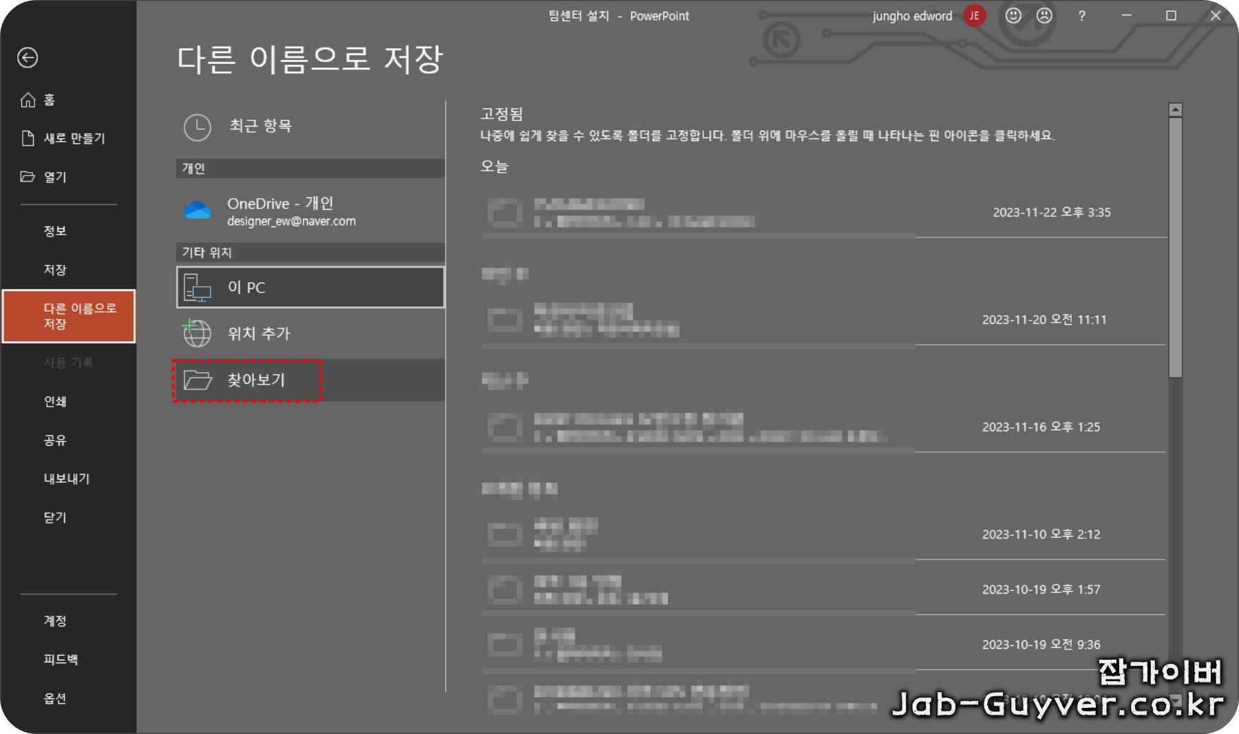 다른이름으로 저장 후 찾아보기를 선택해 로컬PC에 저장합니다.
