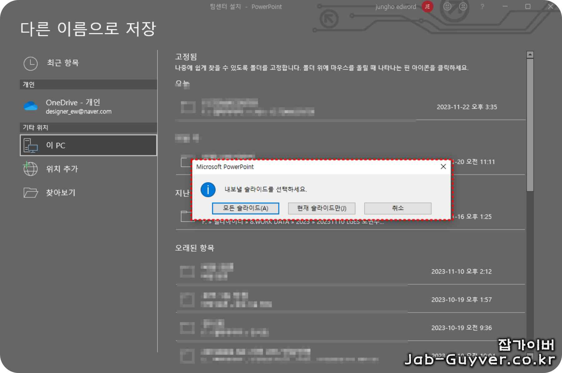 그럼 현재 파워포인트 슬라이드를 모두 저장할 것인지 하나의 슬라이드만 저장할것인지 선택할 수 있습니다.