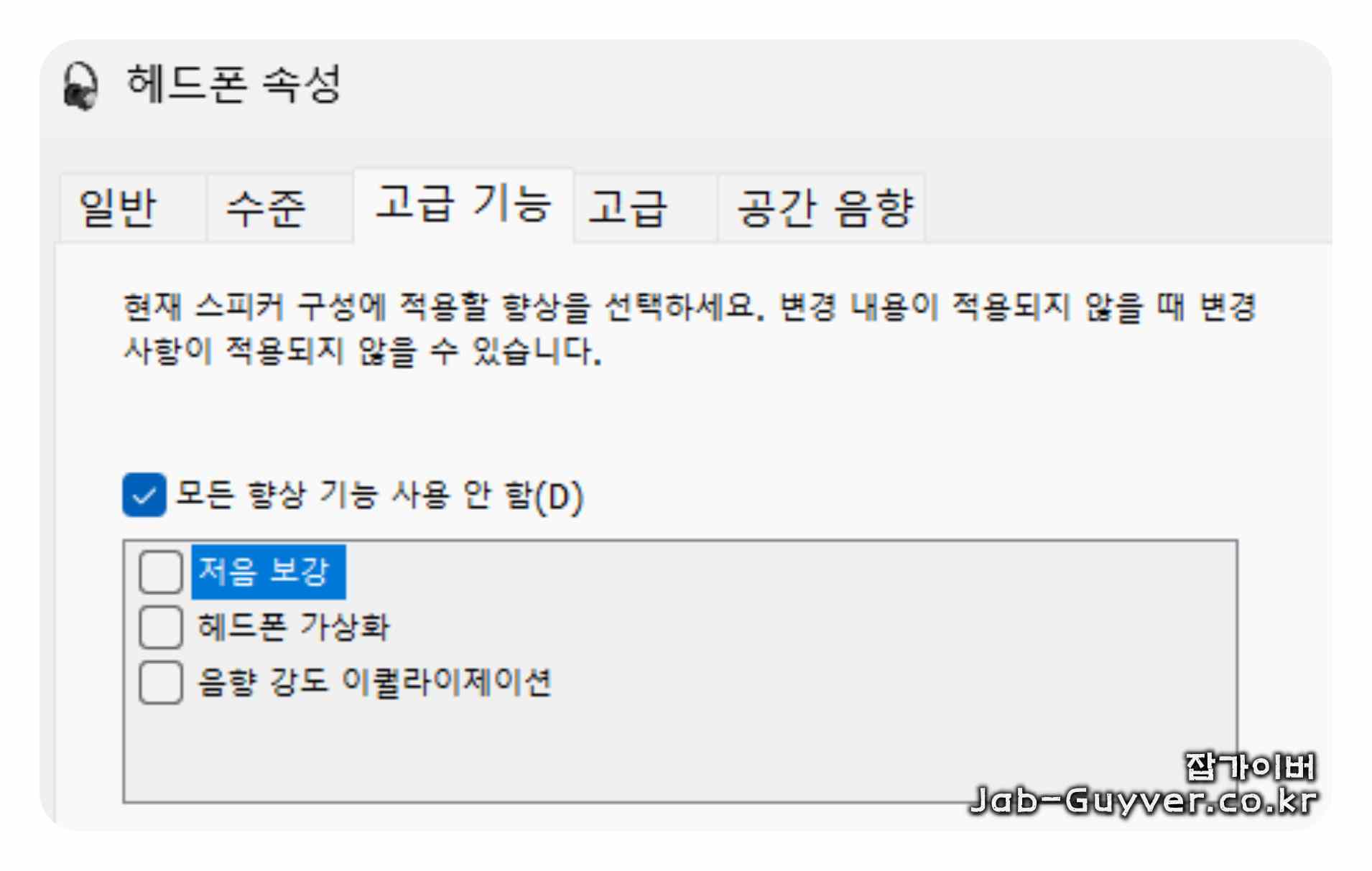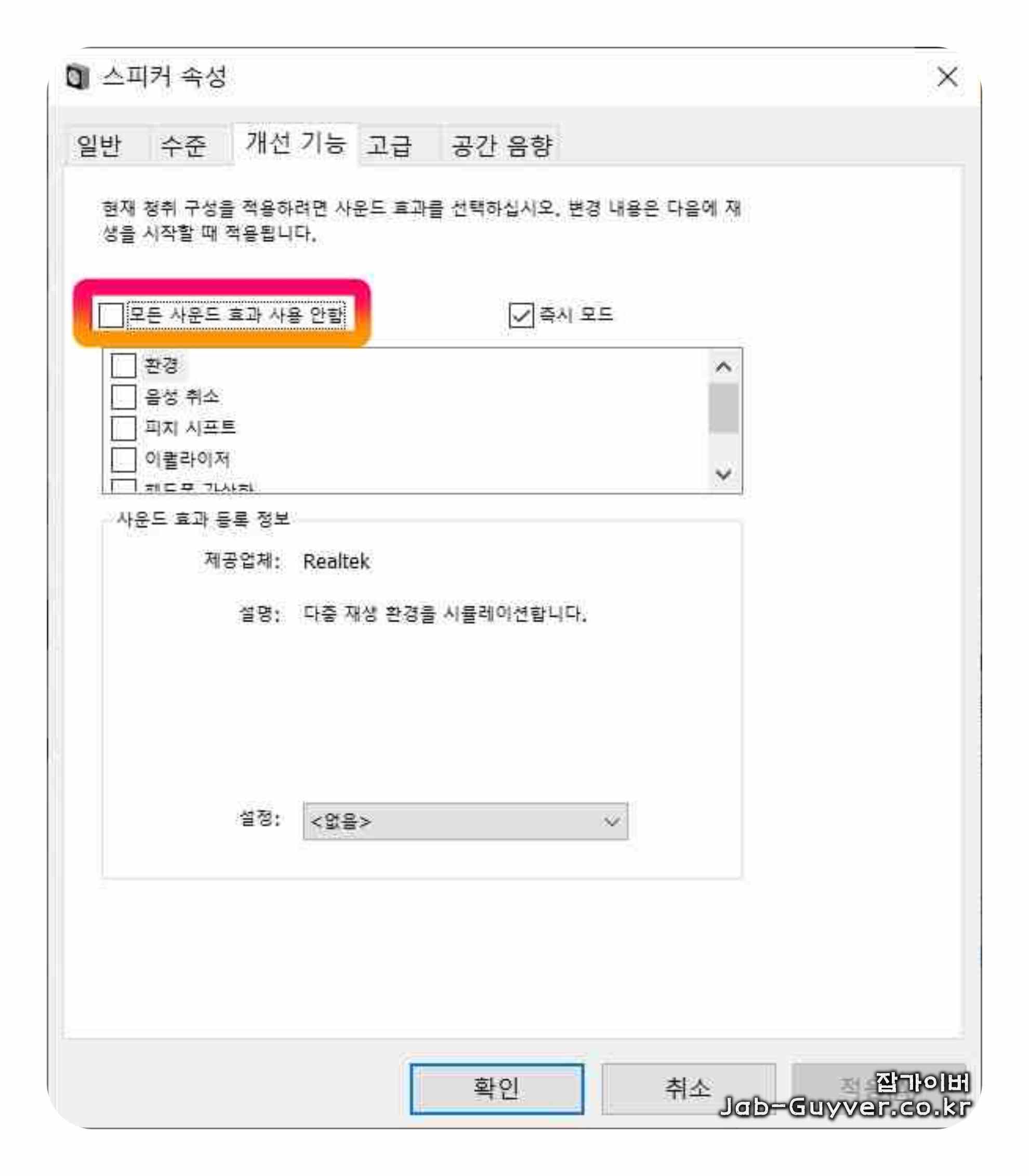 스피커 속성 - 개선기능 - 모든 사운드효과 사용안함