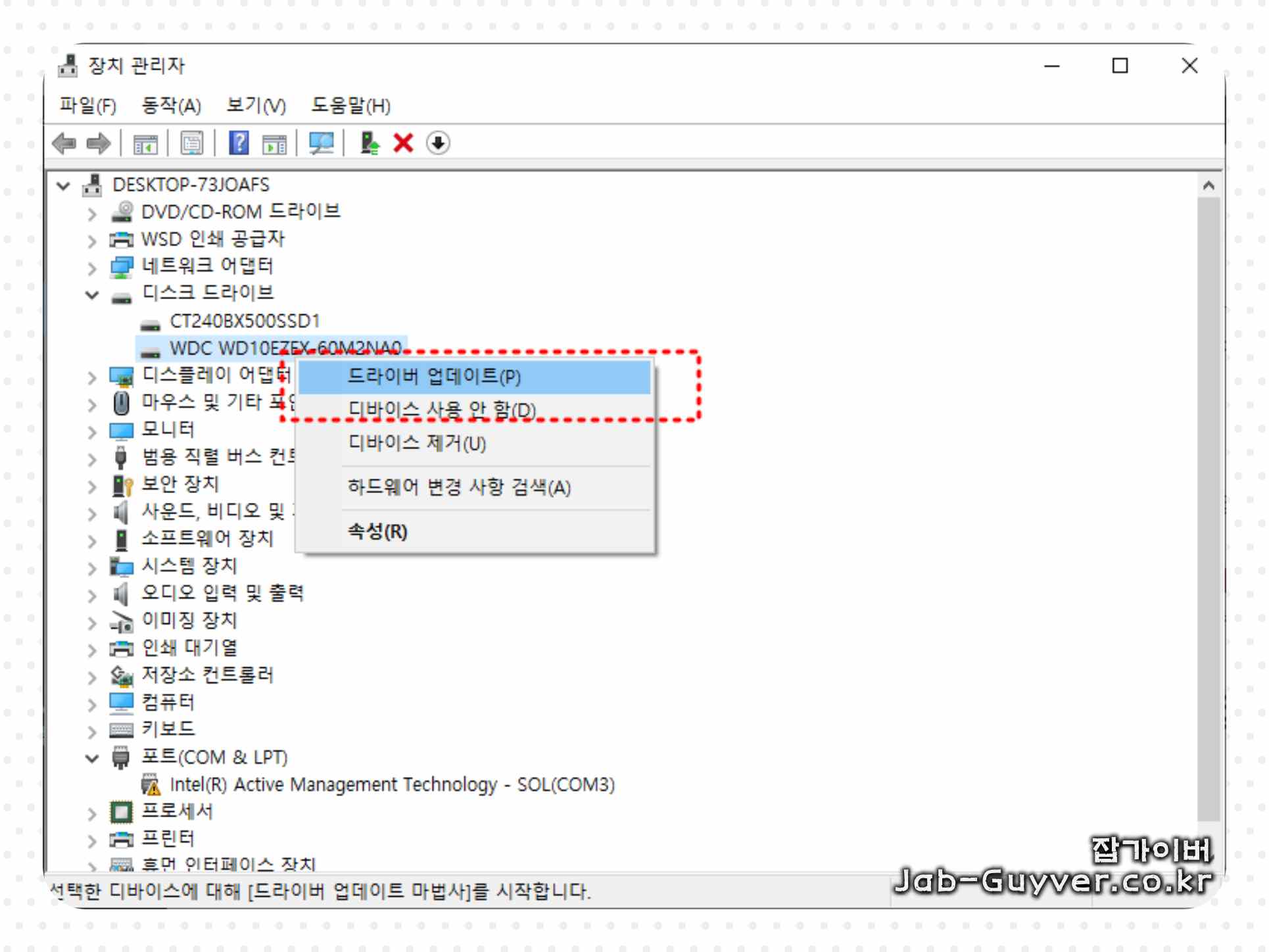 컴퓨터 관리에서 IDE ATA/ATAPI 컨트롤러의 속성을 확인하고, 전송 모드를 'PIO Only'로 설정합니다.
