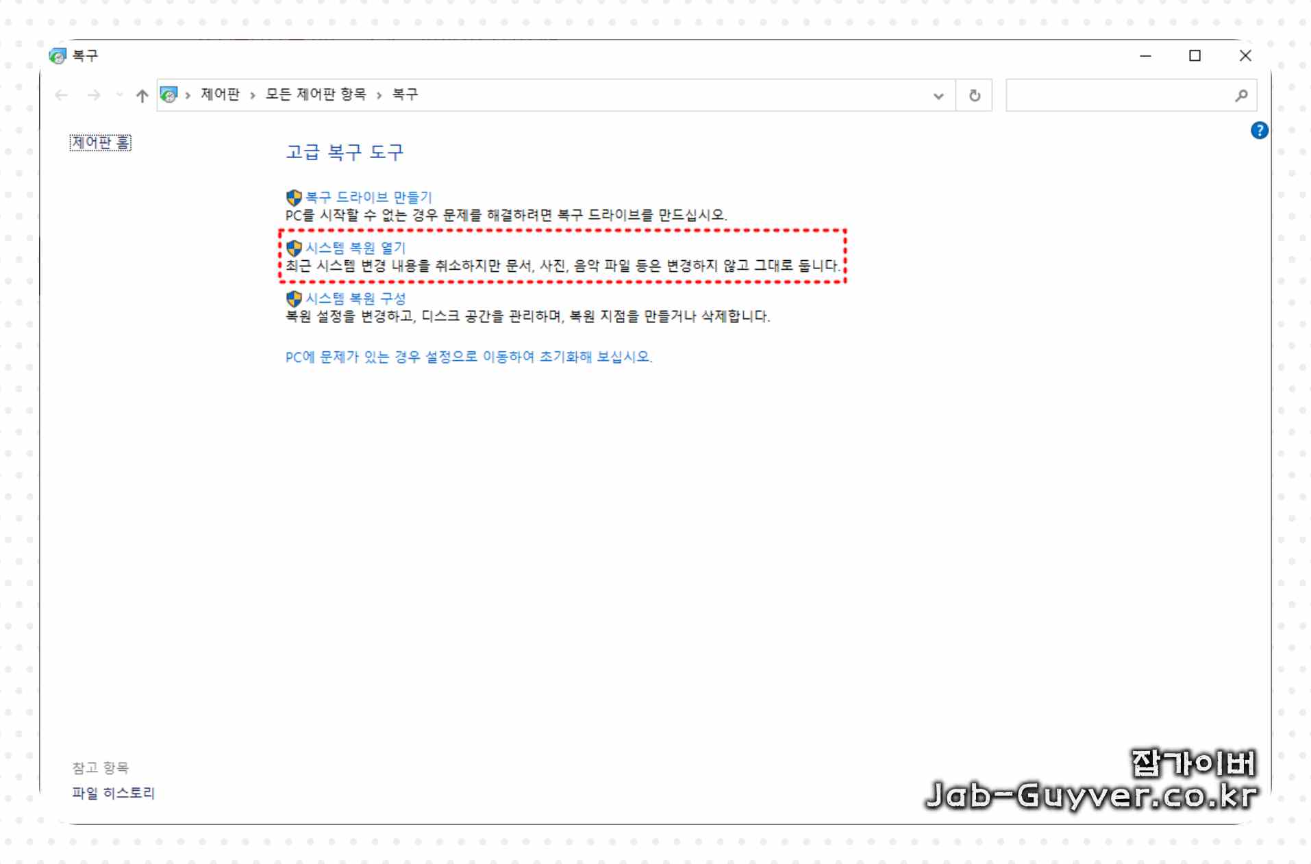 그 외에도 지속적으로 장치오류가 발생한다면 시스템 복원을 통해 문제가 발생하기 전 상태로 윈도우 복구지점을 찾아 복원을 진행합니다.