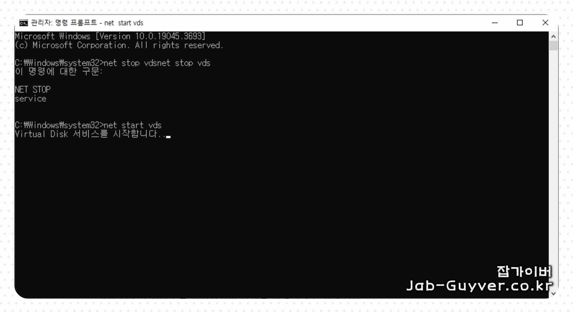 가상 디스크 오류가 발생한다면 가상 디스크 서비스를 재부탕하여 문제를 해결합니다.