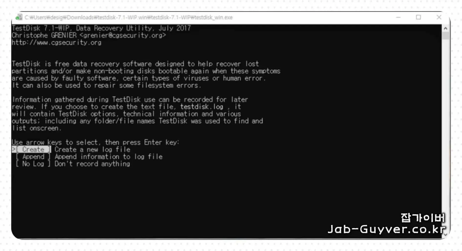 testdisk.exe 프로그램을 실행하면 세 가지 옵션 중 하나를 선택할 수 있으며 'Create' (로그 파일을 새로 생성), 'Append' (기존 로그 파일에 정보 추가), 'No Log' (로그 파일 기록 없이 진행). 일반적으로 'Create'를 선택하면 복구 과정에서 발생하는 모든 활동이 TXT 확장자의 로그 파일에 기록됩니다. 이는 나중에 문제 해결에 유용할 수 있습니다.