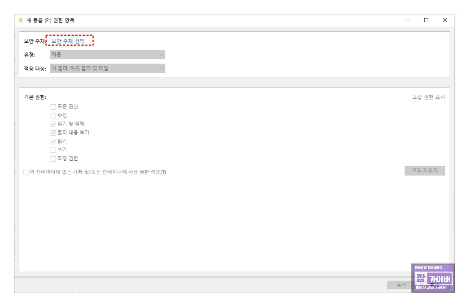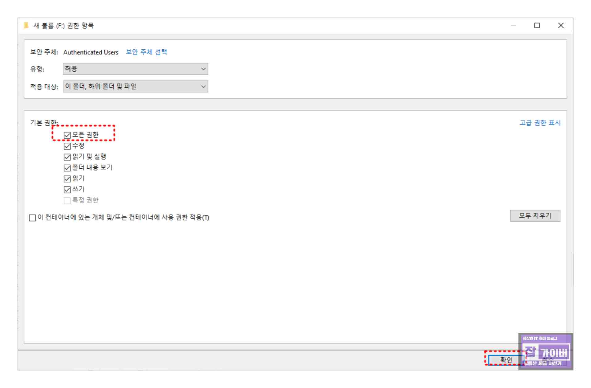 그런 다음 모든 권한을 선택하고 "확인"을 클릭하면 설정이 완료됩니다. 이후에는 해당 디바이스의 하위 디렉터리에도 권한 설정이 적용되므로 약간의 시간이 소요될 수 있습니다.