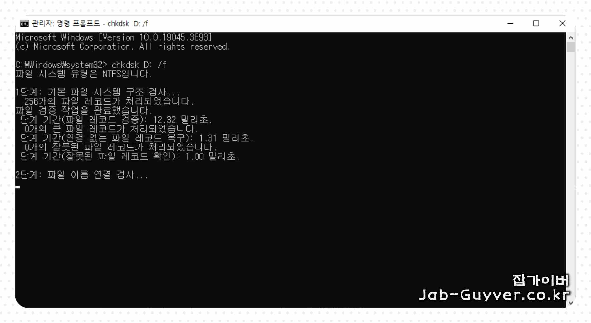 CHKDSK 명령어 입력: 명령프롬프트 창이 열리면, 다음과 같은 형식으로 CHKDSK 명령어를 입력합니다.