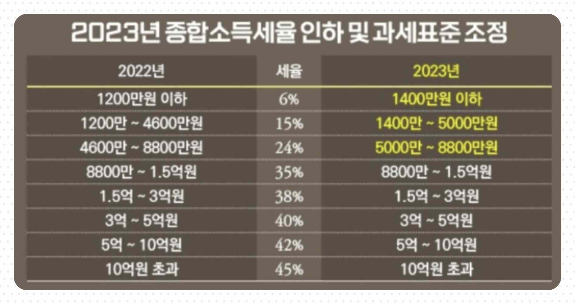 소득세 과세표준이 상향 조정되어 하위 2개의 과세표준 구간이 더 높아졌습니다. 이는 서민과 중산층의 세금 부담을 줄이기 위한 목적으로 이루어진 변화입니다.