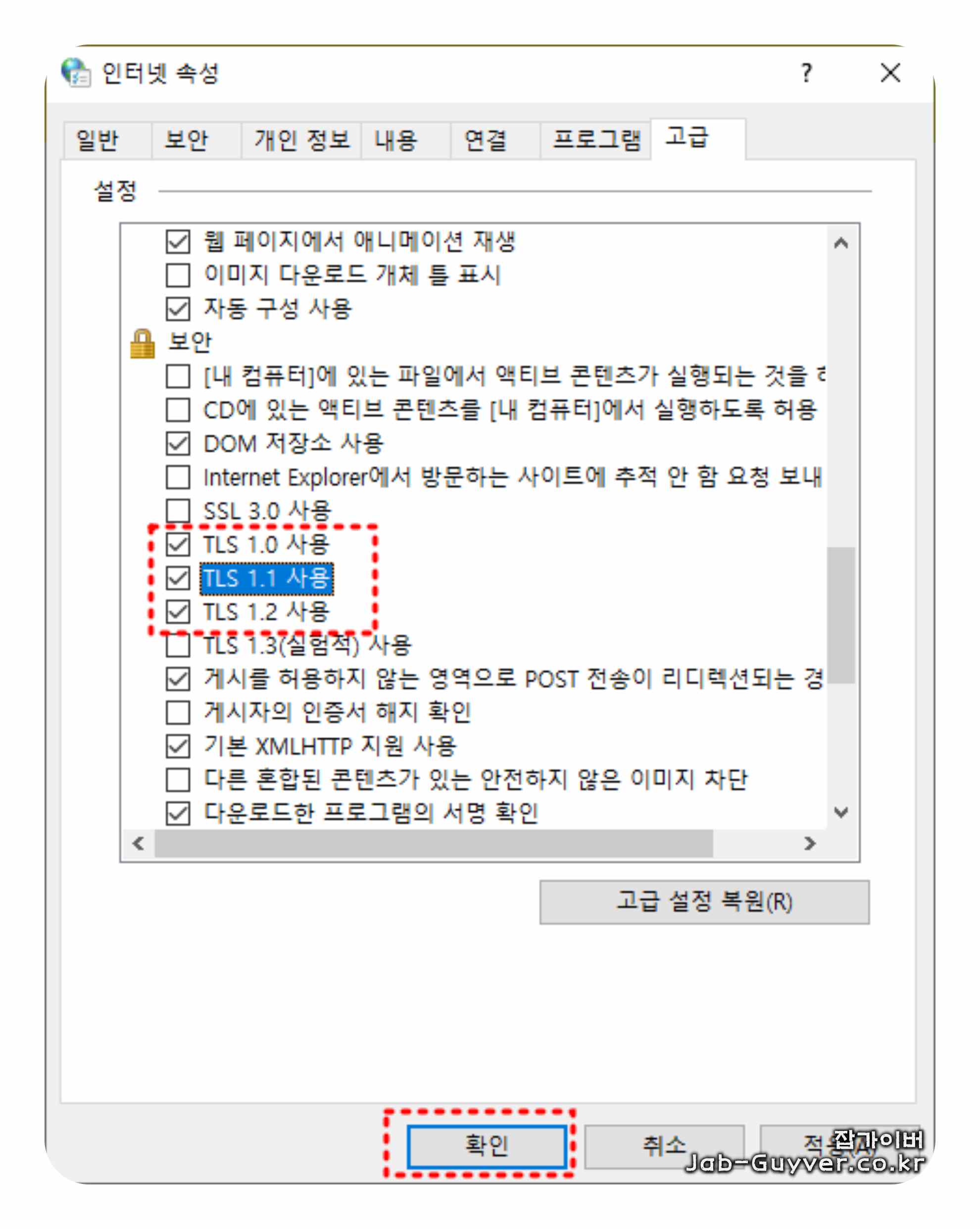 고급 탭에서 TLS 항목을 확인합니다. 요즘 웹 표준은 TLS 1.2와 TLS 1.3가 중심이고, 기관/레거시 시스템은 여전히 TLS 1.0/1.1을 요구하는 곳도 남아 있습니다.