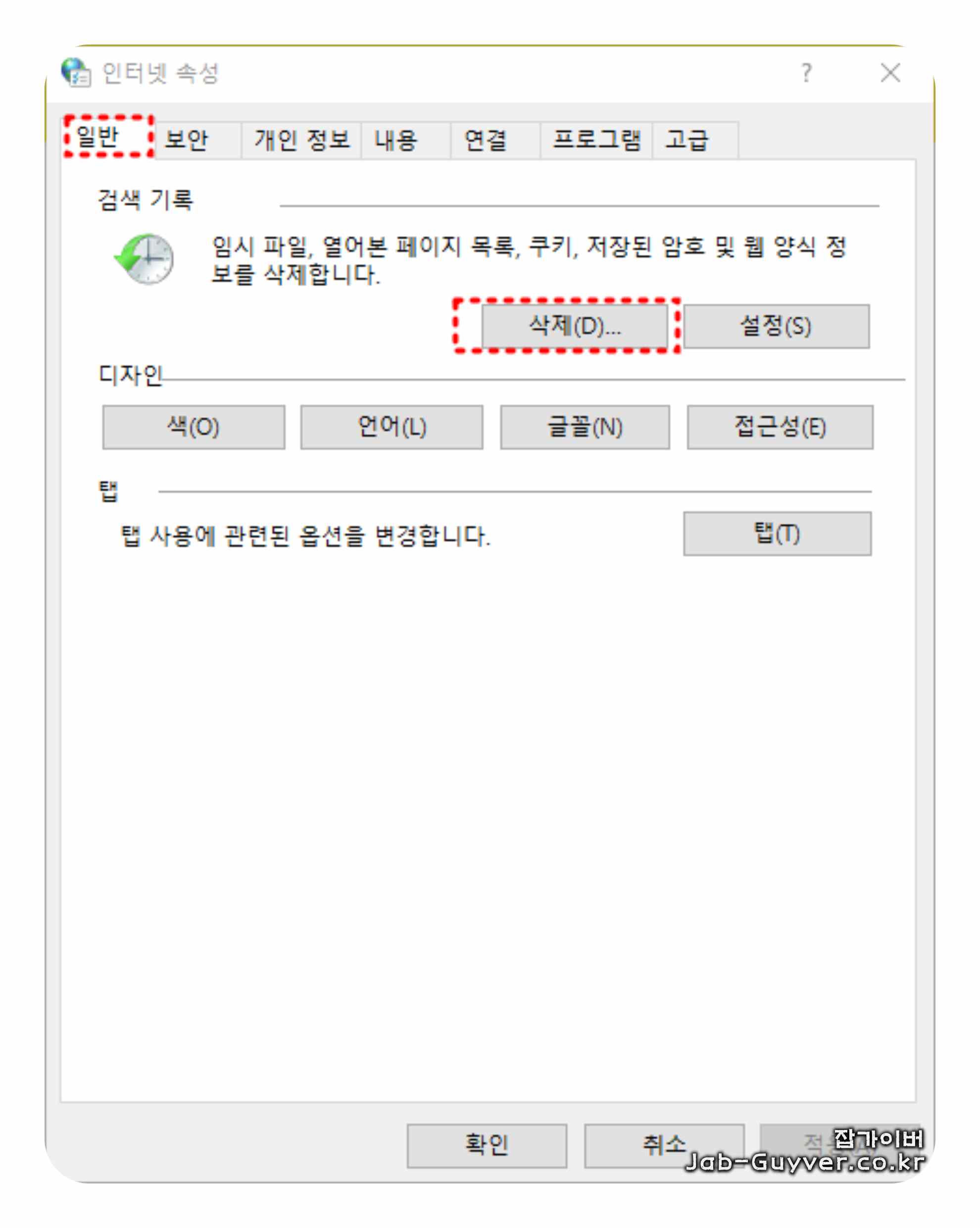추가 후에는 일반 탭에서 검색 기록을 정리합니다.