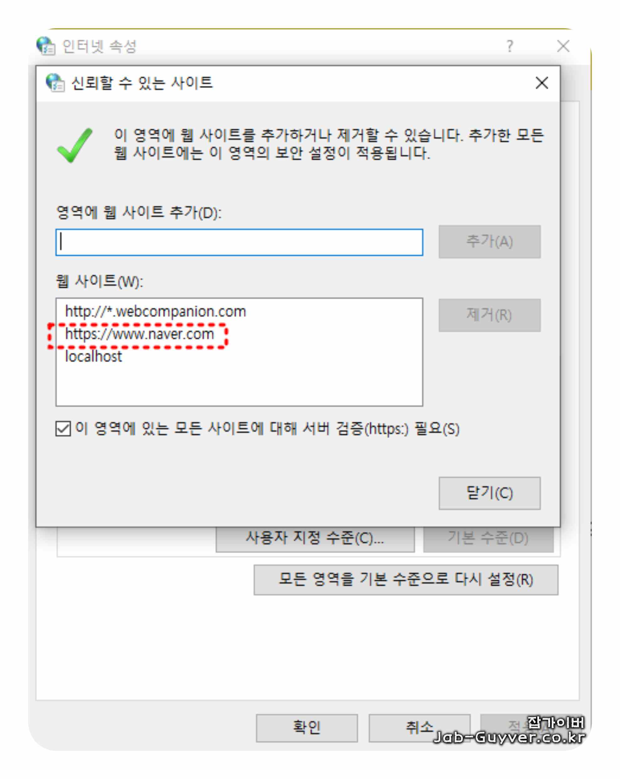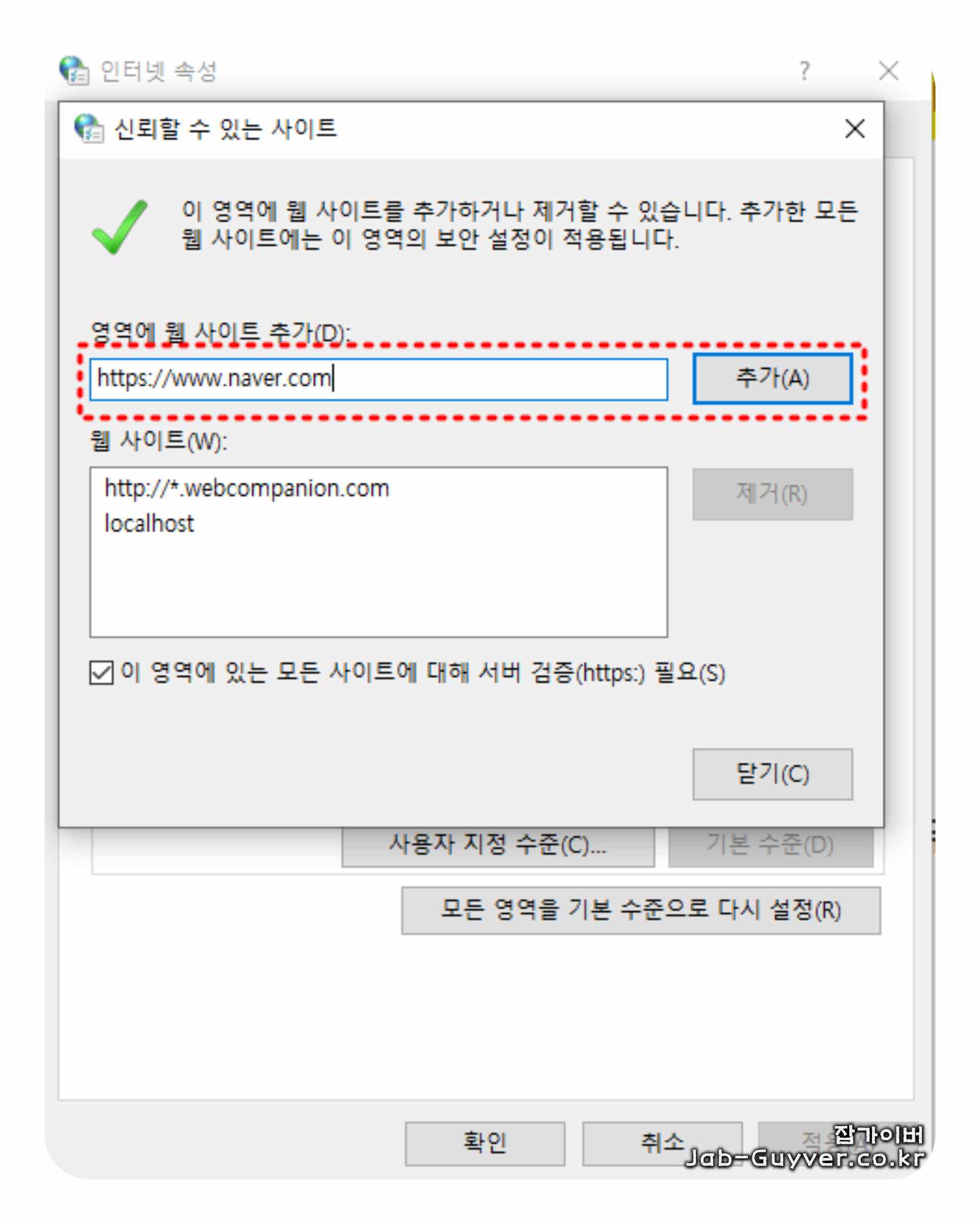 인터넷 옵션 신뢰할 수 있는 사이트 추가