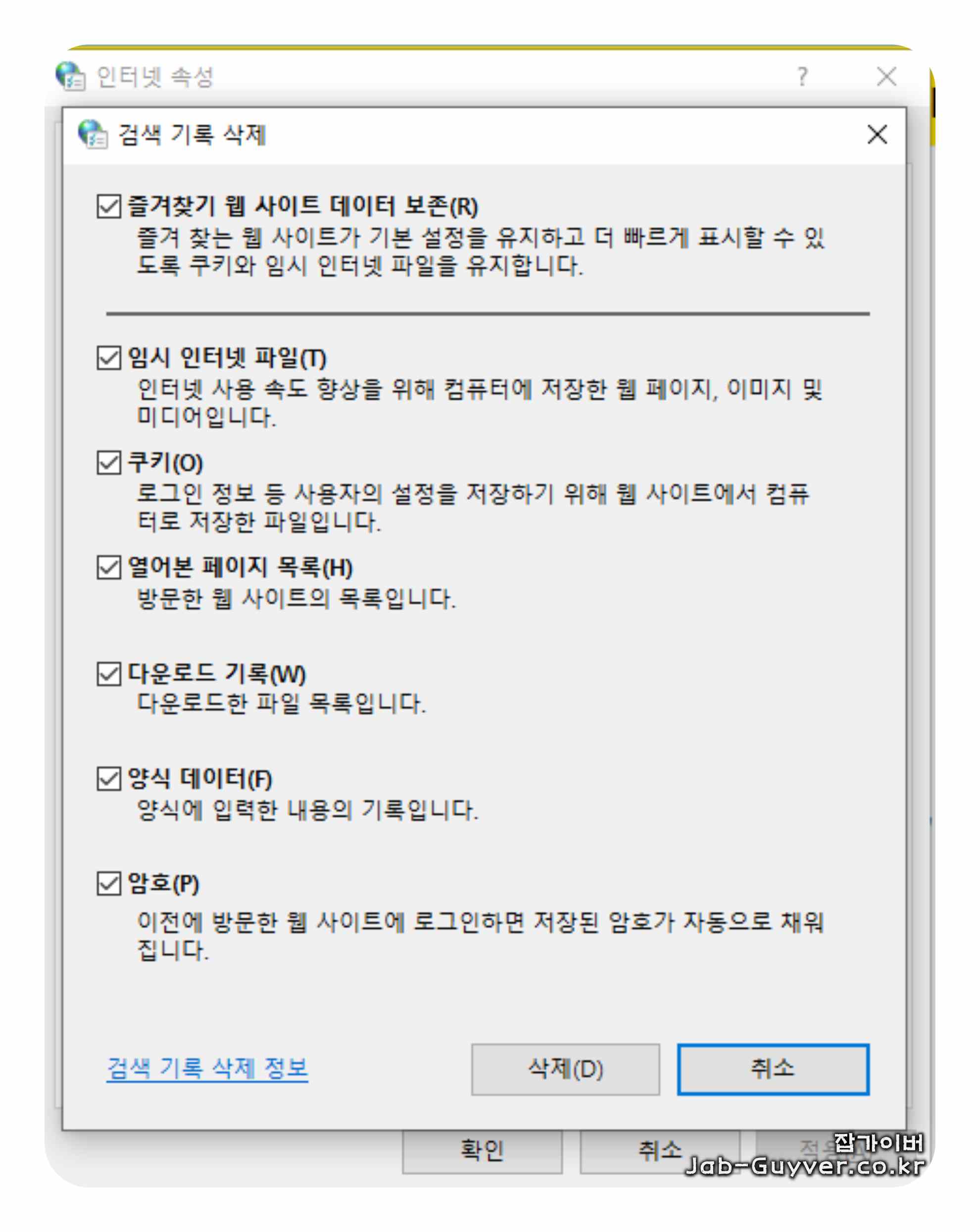 신뢰할 수 있는 사이트를 추가했다면 일반탭으로 이동 후 검색 기록에 대한 임시파일 및 열어본 페이지, 쿠키, 저장된 암호 등 기존의 인터넷 캐시정보를 모두 삭제합니다.