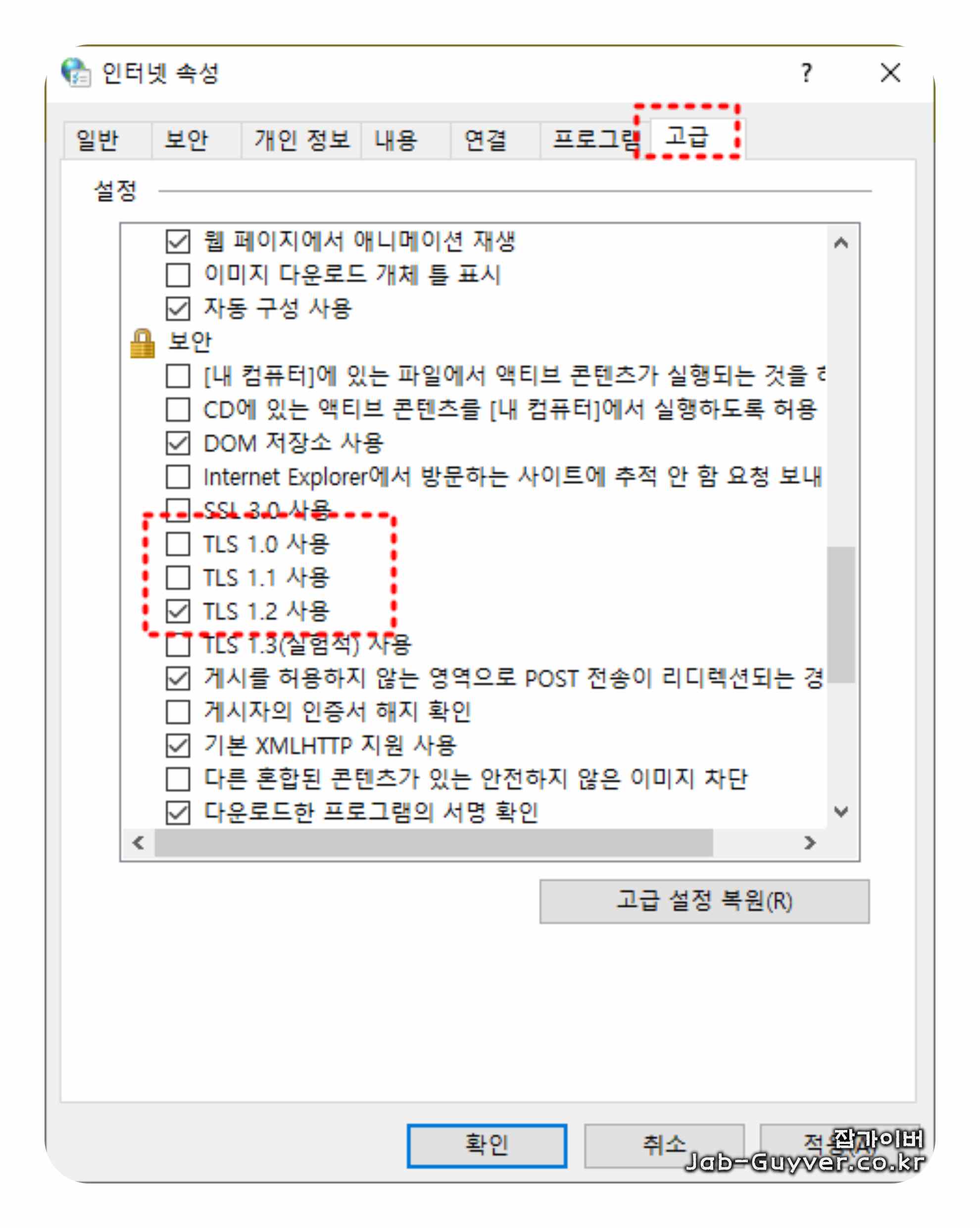 다음 고급탭으로 이동 후 TLS 1.0, TLS 2.0, TLS 3.0 모두 사용하도록 체크합니다.