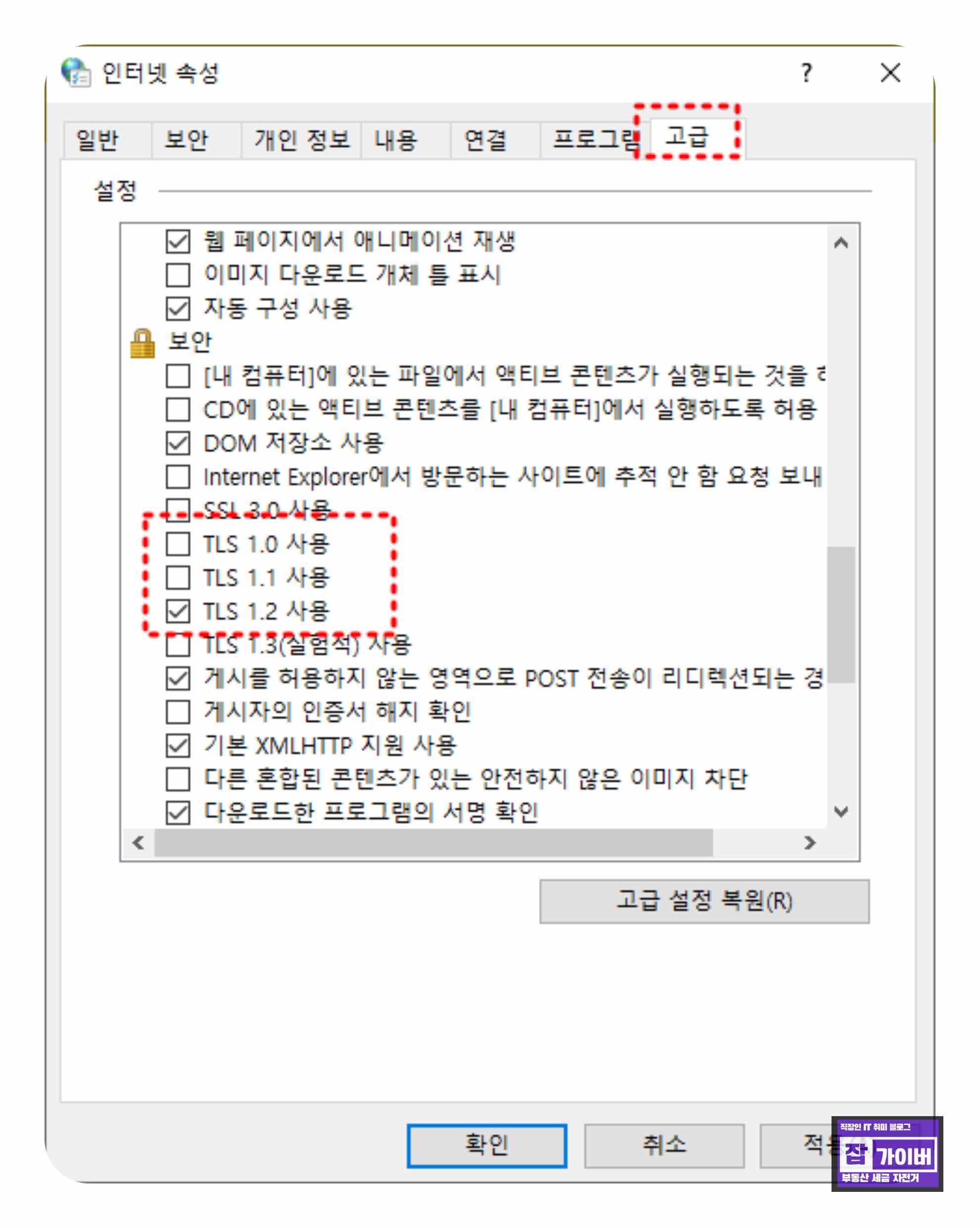 인터넷 보안설정 TLS 활성화
