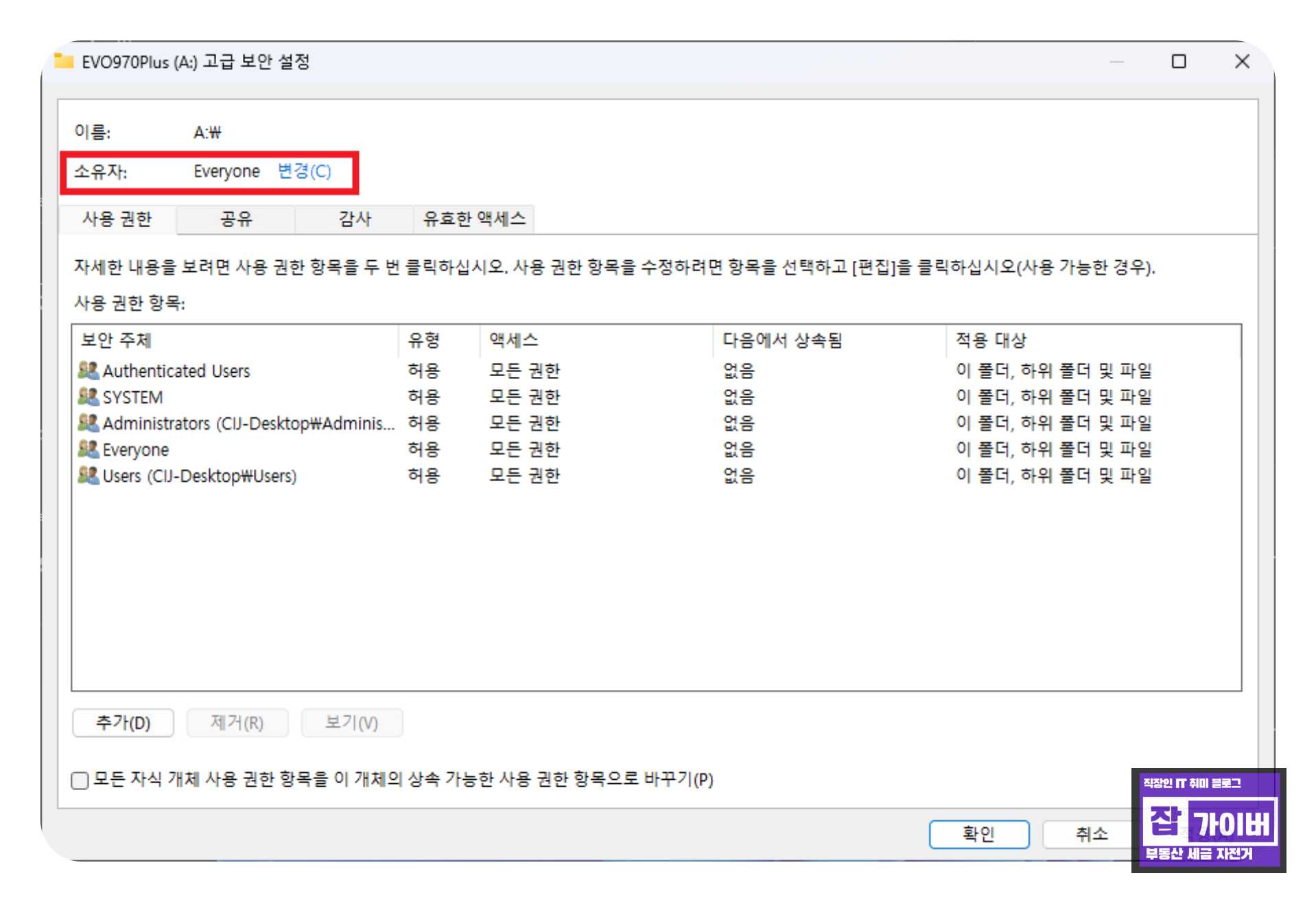 이후 "소유자" 탭으로 이동하고 "변경" 버튼을 누릅니다.