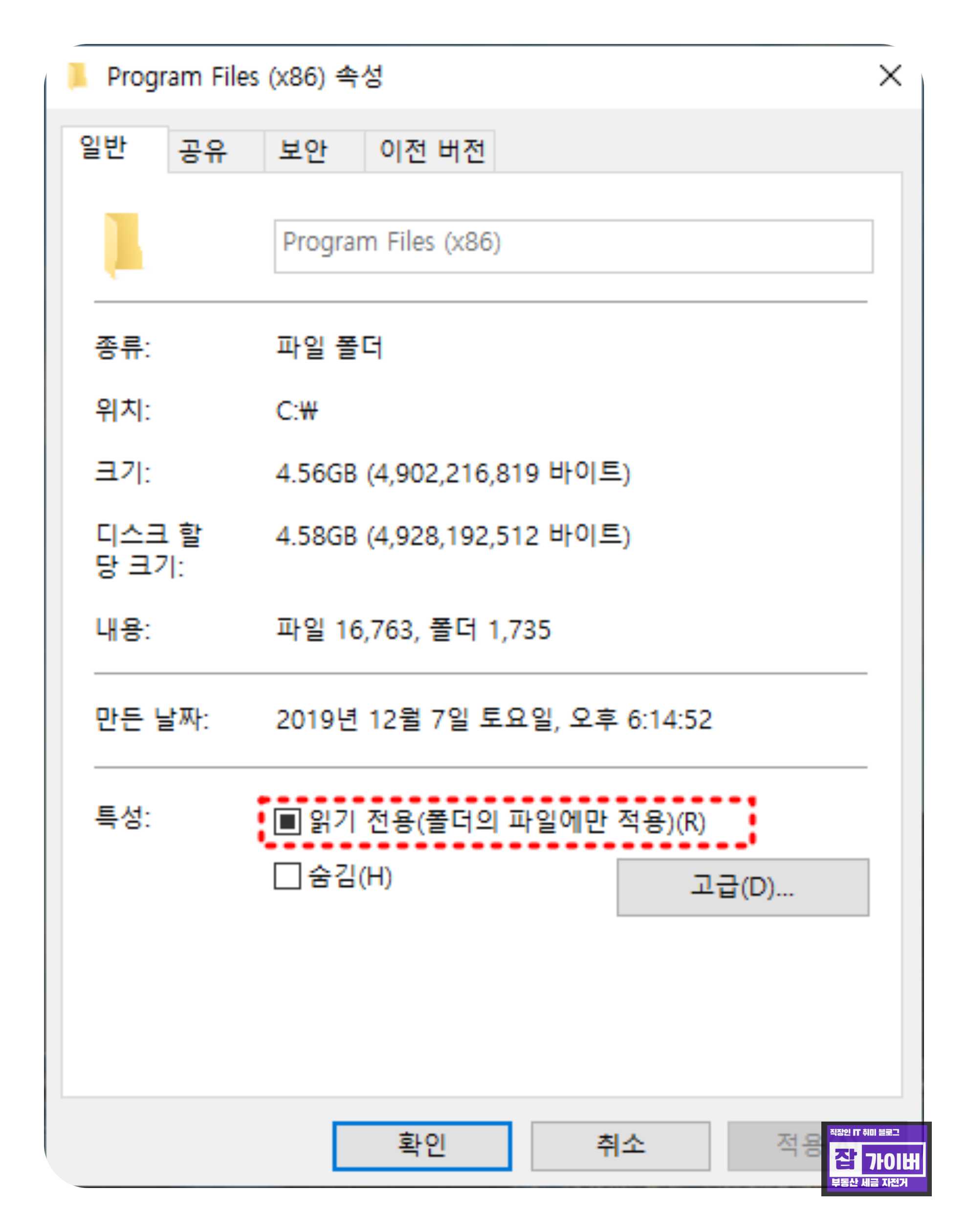 - 변경한 파일이나 폴더의 "속성"으로 다시 이동하여 "일반" 탭을 확인하며 읽기 전용이 체크되어 있지 않은지 확인하고, 변경이 제대로 적용되었는지 확인합니다.