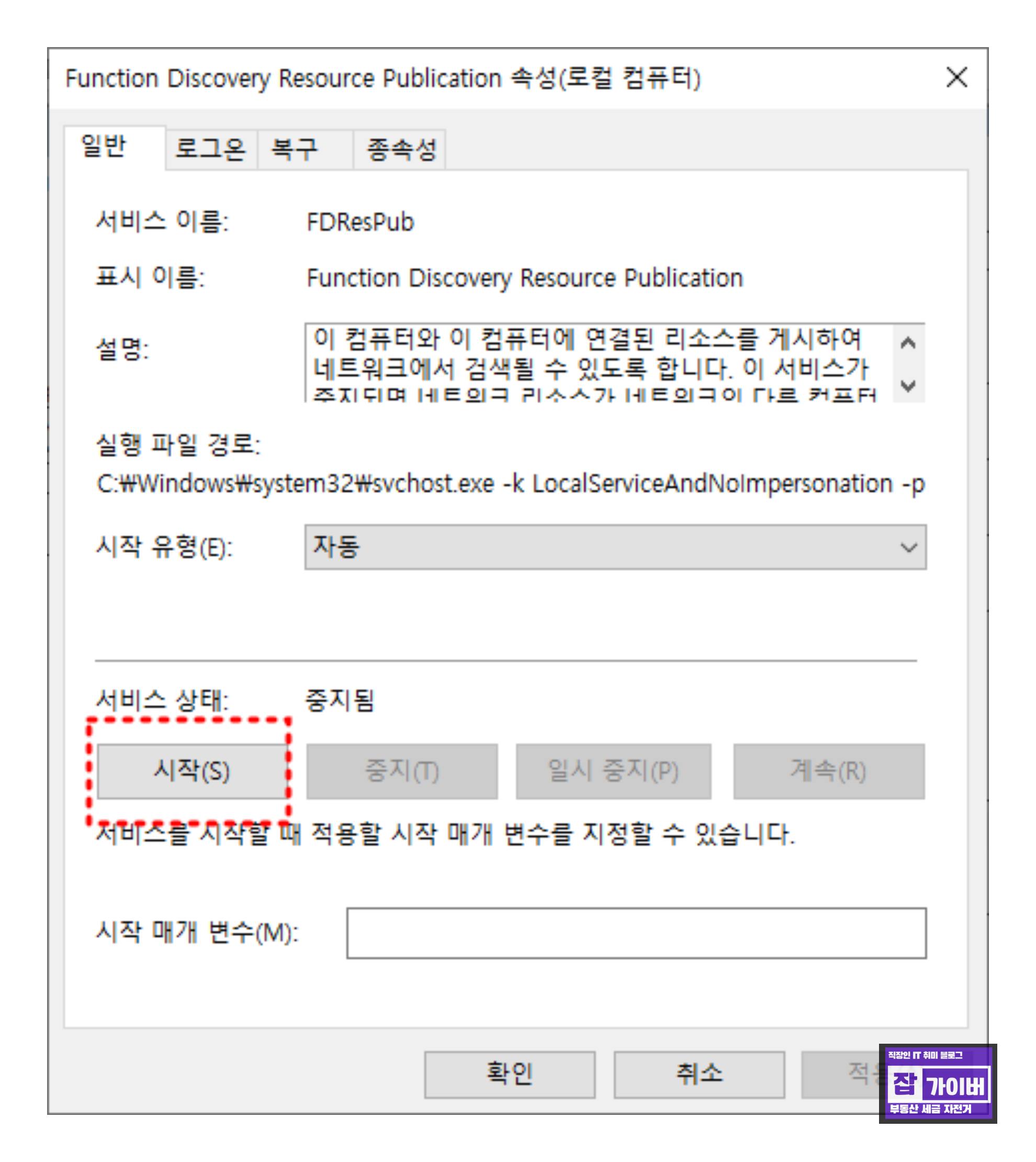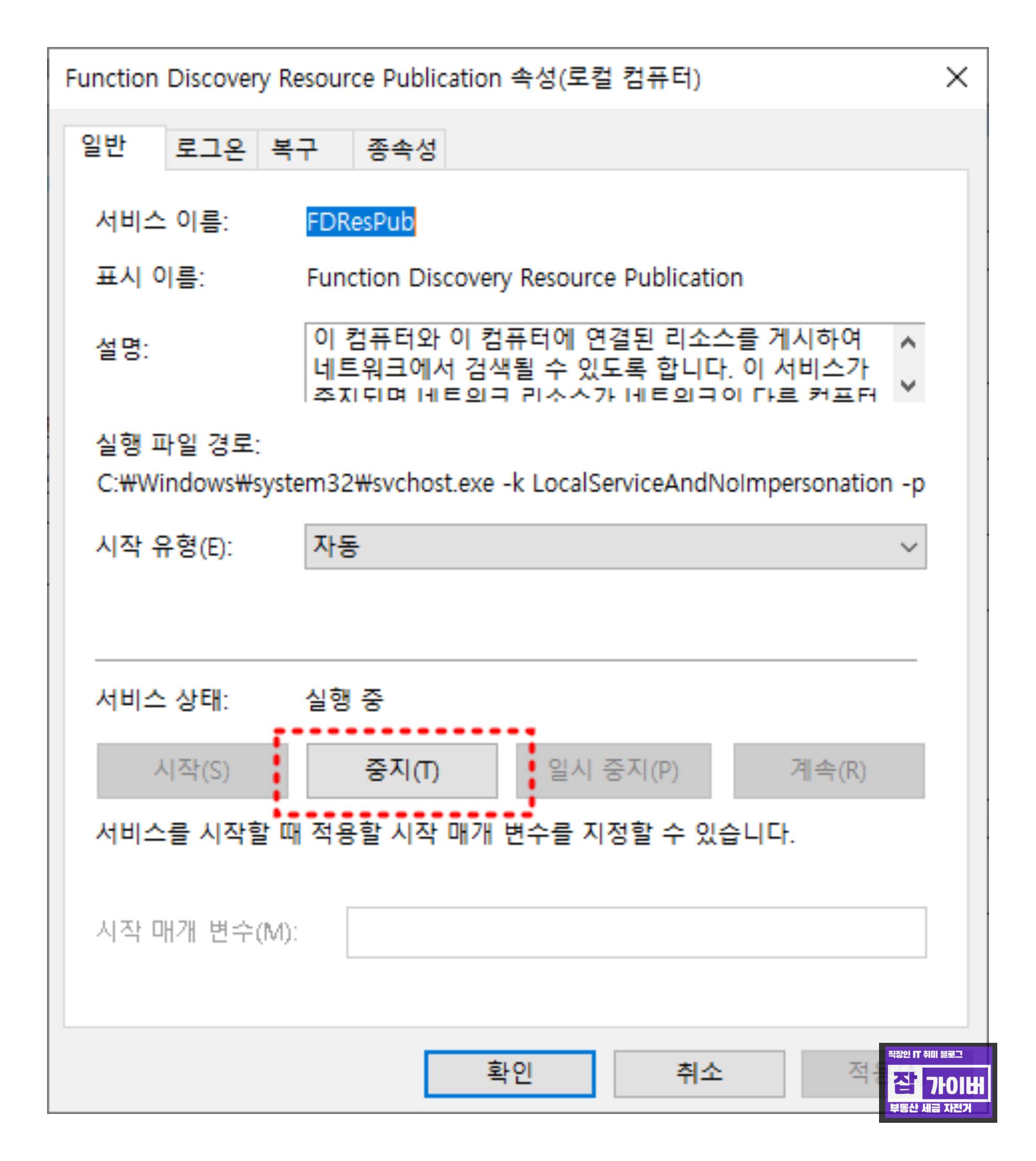 더불어, 네트워크와 관련된 서비스 중 'Function Discovery Resource Publication(FDResPub)' 서비스를 확인하고, 이를 중지한 후 다시 실행시켜야 합니다. 이는 윈도 검색창에 '서비스'를 입력하여 찾을 수 있습니다. 여기서 'FDResPub' 항목을 찾아 중지한 후 다시 실행합니다.