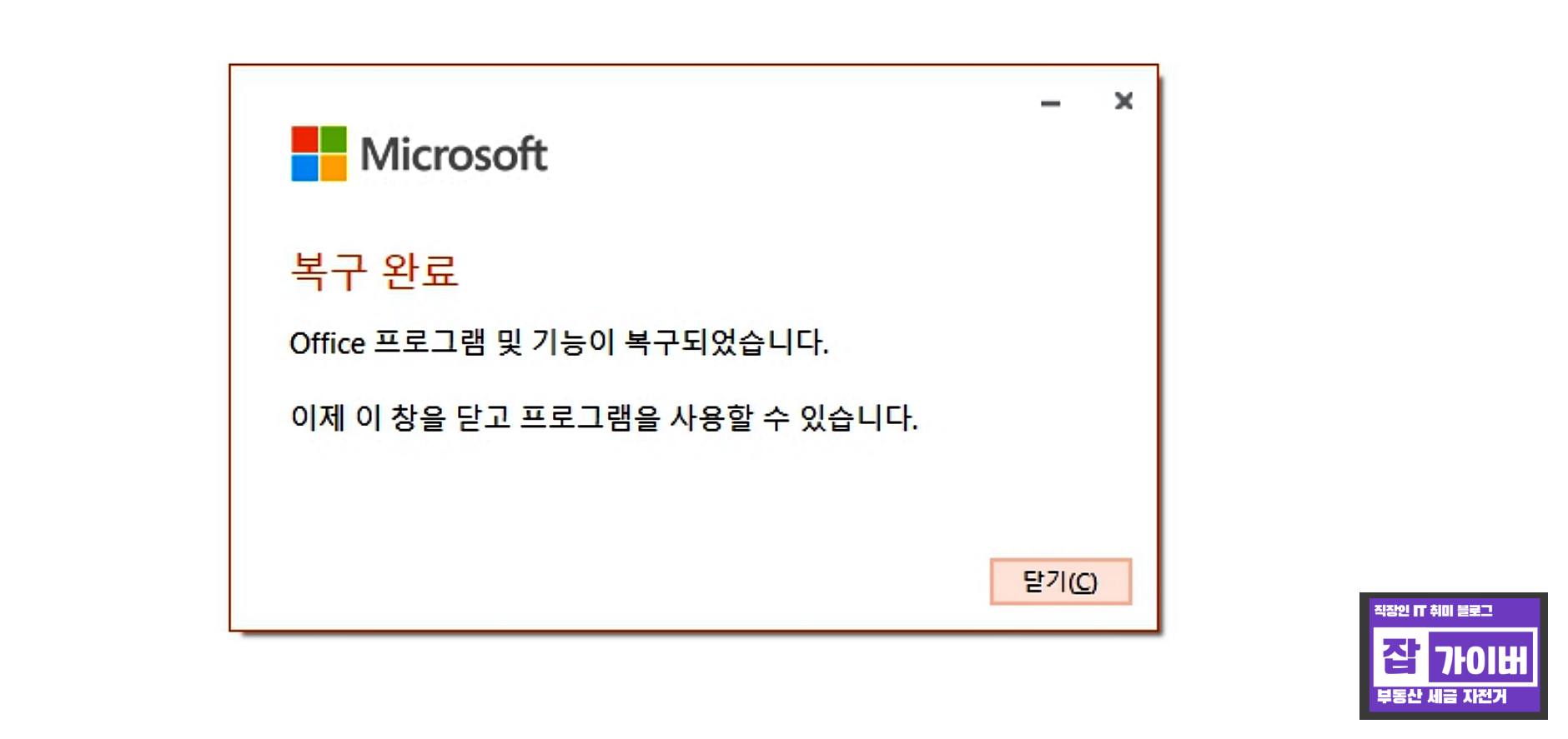 이후 오피스 복구가 완료되었으며 이후 엑셀이나 워드, 파워포인드, 아웃룩등 모두 알수 없는 오류 문제가 해결되어 정상적으로 설치 및 실행이 되었습니다.