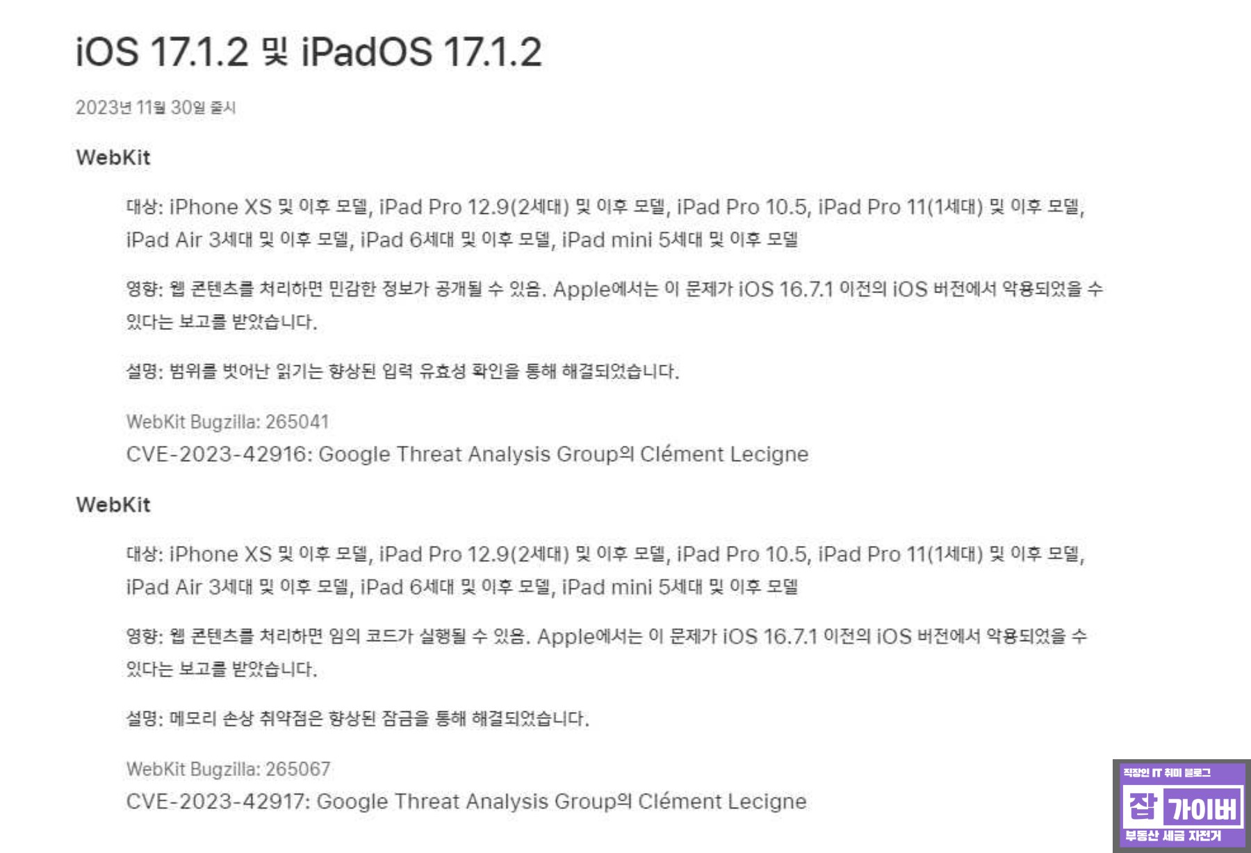 - 문제: 웹 콘텐츠를 처리하면 민감한 정보가 공개될 수 있습니다. Apple은 이 문제가 iOS 16.7.1 이전 버전의 iOS에서 악용되었을 수 있다는 보고를 인지하고 있습니다.
