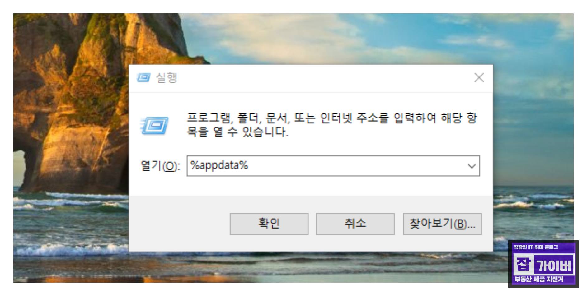 윈도우 실행 화면에서 "%appdata%"를 입력하고 확인을 선택하여 AppData/Roaming 폴더로 이동합니다.