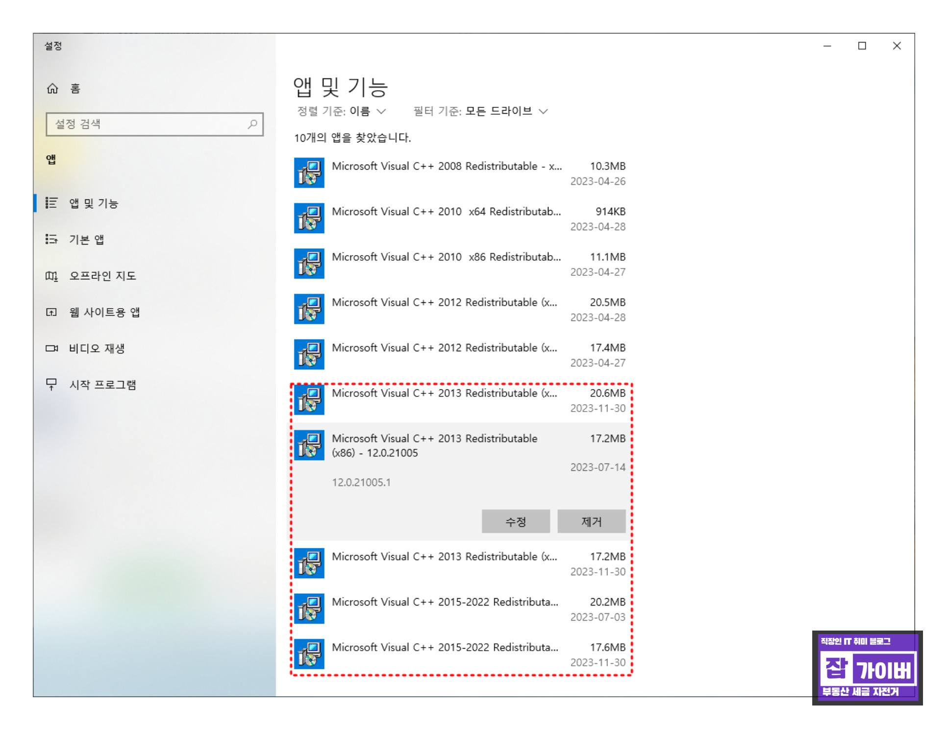 윈도우 설정으로 들어가서 마이크로소프트 비주얼 C++ 2013과 비주얼 C++ 2015를 삭제한 후, 해당 버전들을 다시 설치합니다. 이를 통해 한컴오피스에서 필요한 비주얼 C++ 팩들이 정상적으로 설치되면서 문제가 해결될 것입니다.