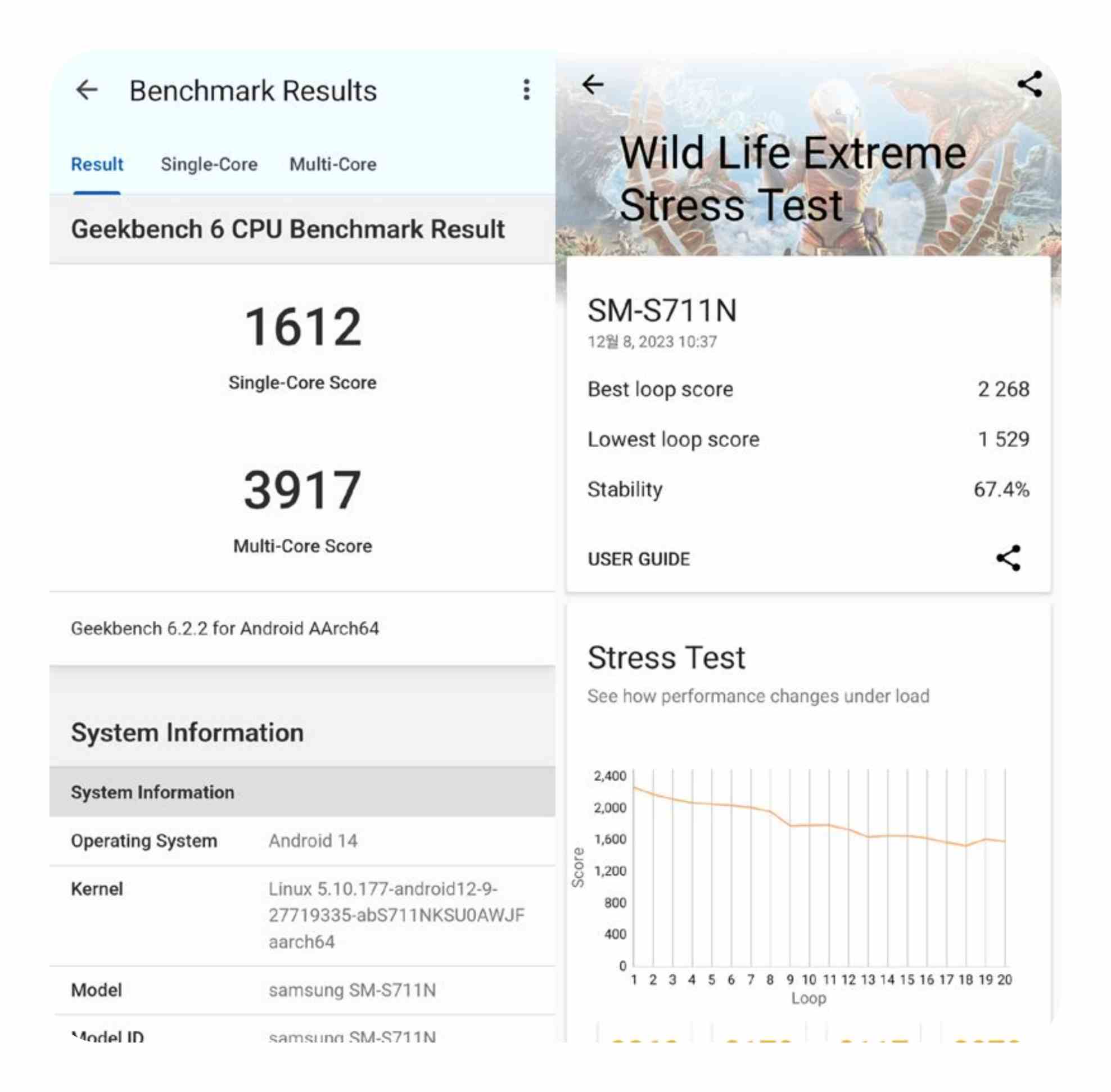 갤럭시S23 FE에서는 엑시노스2200 프로세서가 도입되었는데, 이는 S22에서의 엑시노스2200에 비해 개선된 버전이다. 성능 향상은 물론, 발열 문제 등의 논란이 줄어든 것으로 나타났다. 벤치마크 결과를 보면 긱벤치6에서 싱글코어 1612점, 멀티코어 3917점을 기록했으며, 3D마크 와일드 라이프 익스트림 스트레스 테스트에서 안정성이 이전보다 개선되었다.