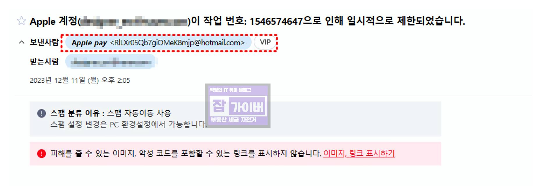 그래서 확인해보니 보낸메일 주소가 ApplePay라고 되어 있지만 보낸메일이 애플메일이 아닌 핫메일로 온점도 이상합니다.