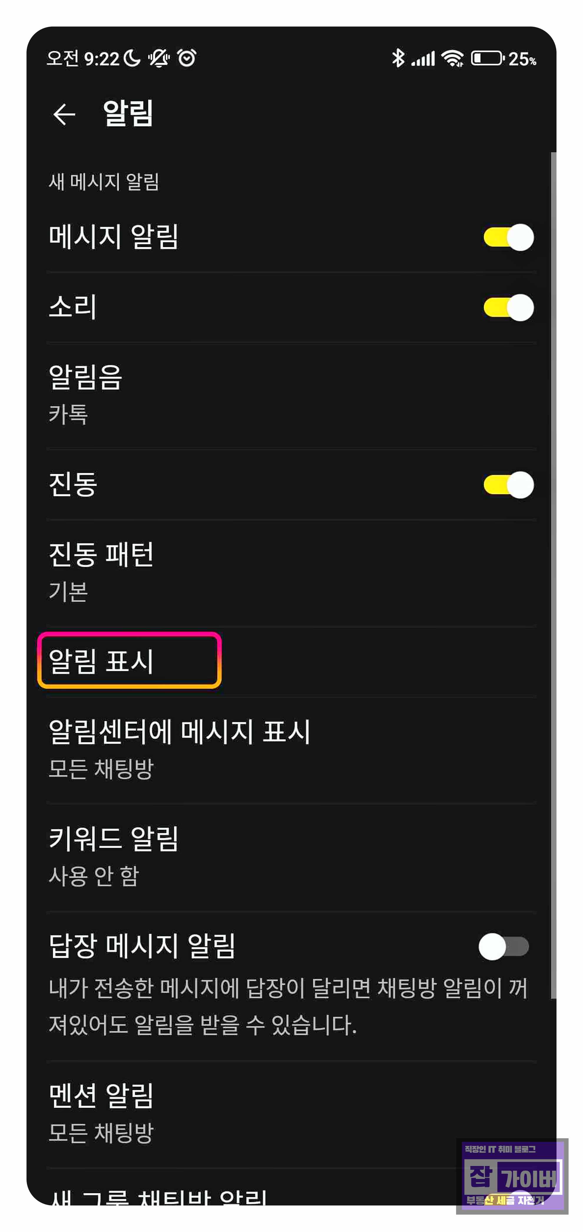 기타 권한을 점검했다면, 다시 한 번 뒤로 돌아가서 이번에는 알림 메뉴를 열어봅니다.