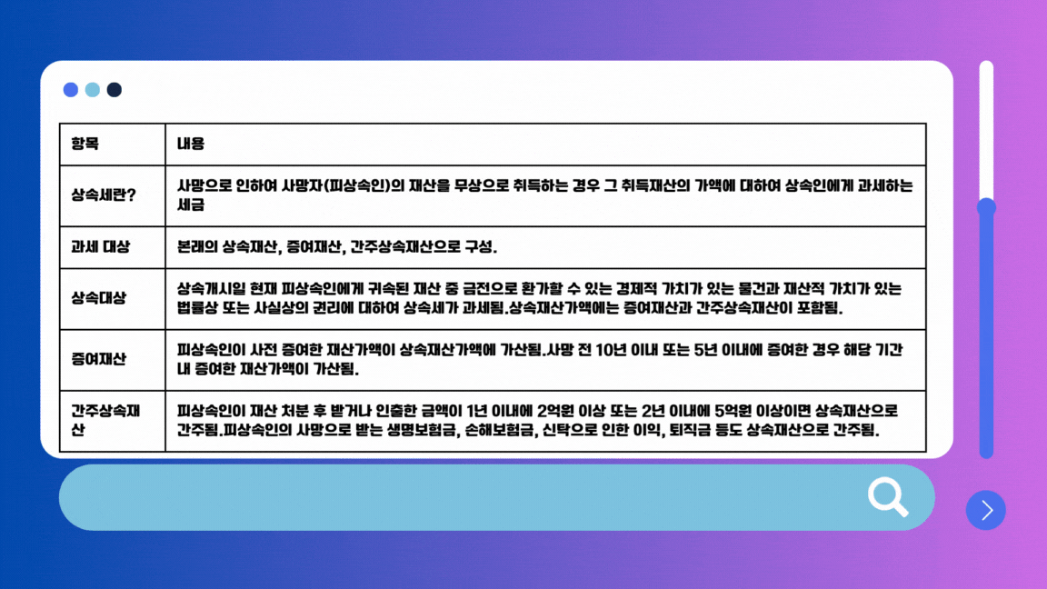 | 간주상속재산 | 피상속인이 재산 처분 후 받거나 인출한 금액이 1년 이내에 2억원 이상 또는 2년 이내에 5억원 이상이면 상속재산으로 간주됨. 피상속인의 사망으로 받는 생명보험금, 손해보험금, 신탁으로 인한 이익, 퇴직금 등도 상속재산으로 간주됨. |